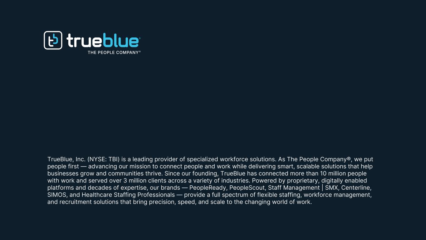 TrueBlue, Inc. (NYSE: TBI) is a leading provider of specialized workforce solutions. As The People Company®, we put people first — advancing our mission to connect people and work while delivering smart, scalable solutions that help businesses grow and communities thrive. Since our founding, TrueBlue has connected more than 10 million people with work and served over 3 million clients across a variety of industries. Powered by proprietary, digitally enabled platforms and decades of expertise, our brands — PeopleReady, PeopleScout, Staff Management | SMX, Centerline, SIMOS, and Healthcare Staffing Professionals — provide a full spectrum of flexible staffing, workforce management, and recruitment solutions that bring precision, speed, and scale to the changing world of work.