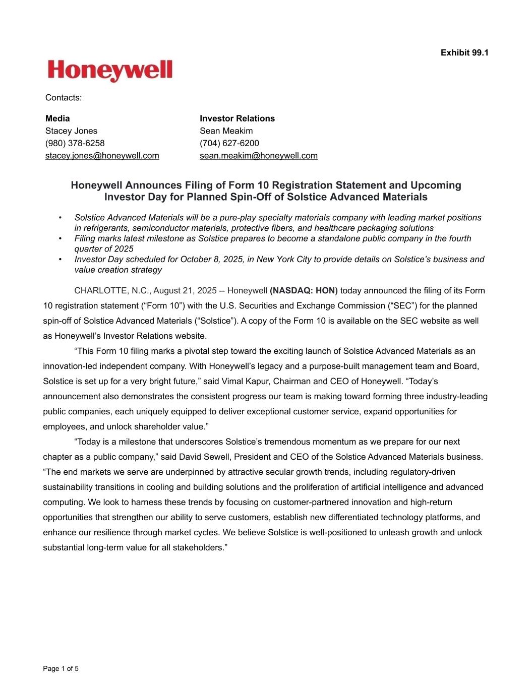 Exhibit 99.1 Contacts: Media Investor Relations Stacey Jones Sean Meakim (980) 378-6258 (704) 627-6200 stacey.jones@honeywell.com sean.meakim@honeywell.com Honeywell Announces Filing of Form 10 Registration Statement and Upcoming Investor Day for Planned Spin-Off of Solstice Advanced Materials • Solstice Advanced Materials will be a pure-play specialty materials company with leading market positions in refrigerants, semiconductor materials, protective fibers, and healthcare packaging solutions • Filing marks latest milestone as Solstice prepares to become a standalone public company in the fourth quarter of 2025 • Investor Day scheduled for October 8, 2025, in New York City to provide details on Solstice’s business and value creation strategy CHARLOTTE, N.C., August 21, 2025 -- Honeywell (NASDAQ: HON) today announced the filing of its Form 10 registration statement (“Form 10”) with the U.S. Securities and Exchange Commission (“SEC”) for the planned spin-off of Solstice Advanced Materials (“Solstice”). A copy of the Form 10 is available on the SEC website as well as Honeywell’s Investor Relations website. “This Form 10 filing marks a pivotal step toward the exciting launch of Solstice Advanced Materials as an innovation-led independent company. With Honeywell’s legacy and a purpose-built management team and Board, Solstice is set up for a very bright future,” said Vimal Kapur, Chairman and CEO of Honeywell. “Today’s announcement also demonstrates the consistent progress our team is making toward forming three industry-leading public companies, each uniquely equipped to deliver exceptional customer service, expand opportunities for employees, and unlock shareholder value.” “Today is a milestone that underscores Solstice’s tremendous momentum as we prepare for our next chapter as a public company,” said David Sewell, President and CEO of the Solstice Advanced Materials business. “The end markets we serve are underpinned by attractive secular growth trends, including regulatory-driven sustainability transitions in cooling and building solutions and the proliferation of artificial intelligence and advanced computing. We look to harness these trends by focusing on customer-partnered innovation and high-return opportunities that strengthen our ability to serve customers, establish new differentiated technology platforms, and enhance our resilience through market cycles. We believe Solstice is well-positioned to unleash growth and unlock substantial long-term value for all stakeholders.” Page 1 of 5