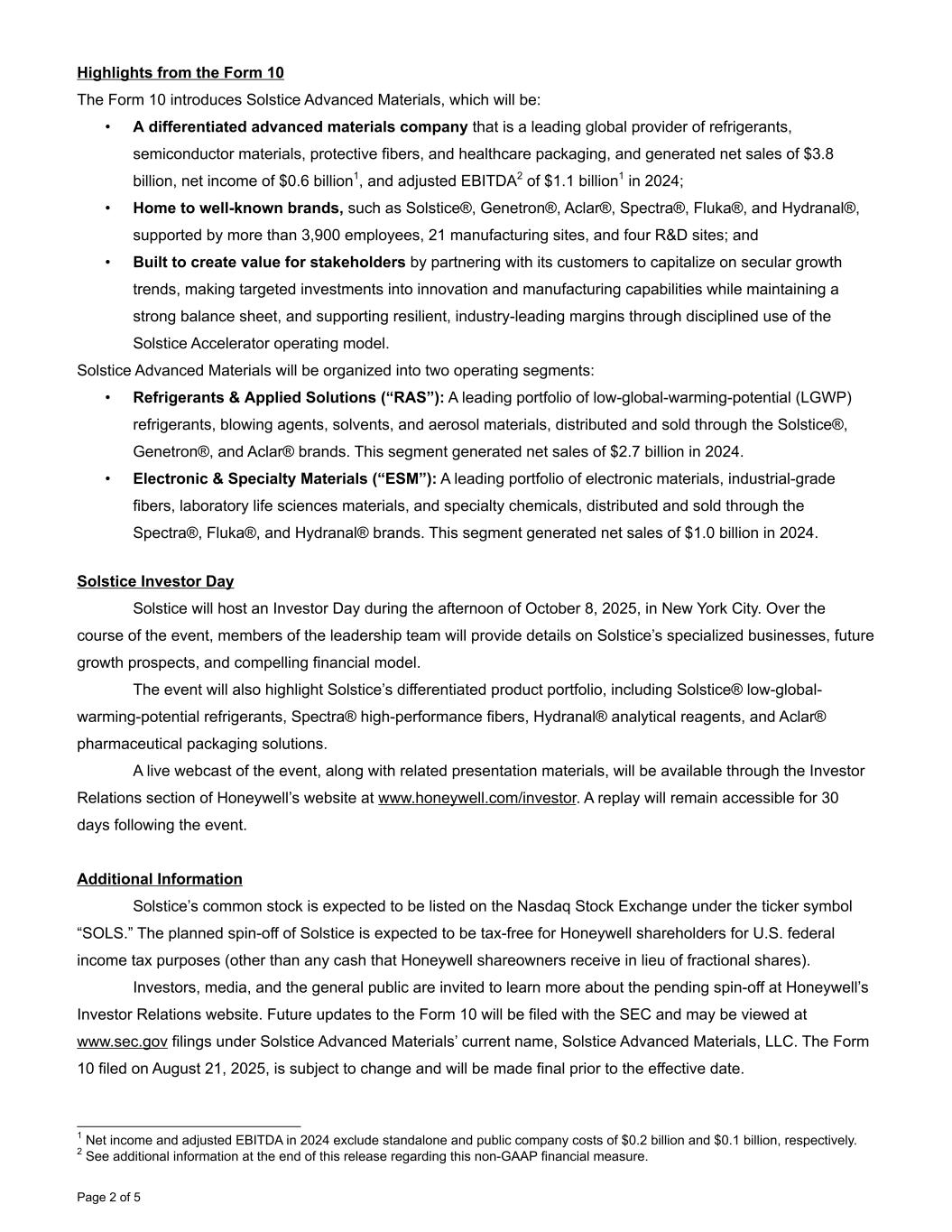 Highlights from the Form 10 The Form 10 introduces Solstice Advanced Materials, which will be: • A differentiated advanced materials company that is a leading global provider of refrigerants, semiconductor materials, protective fibers, and healthcare packaging, and generated net sales of $3.8 billion, net income of $0.6 billion1, and adjusted EBITDA2 of $1.1 billion1 in 2024; • Home to well-known brands, such as Solstice®, Genetron®, Aclar®, Spectra®, Fluka®, and Hydranal®, supported by more than 3,900 employees, 21 manufacturing sites, and four R&D sites; and • Built to create value for stakeholders by partnering with its customers to capitalize on secular growth trends, making targeted investments into innovation and manufacturing capabilities while maintaining a strong balance sheet, and supporting resilient, industry-leading margins through disciplined use of the Solstice Accelerator operating model. Solstice Advanced Materials will be organized into two operating segments: • Refrigerants & Applied Solutions (“RAS”): A leading portfolio of low-global-warming-potential (LGWP) refrigerants, blowing agents, solvents, and aerosol materials, distributed and sold through the Solstice®, Genetron®, and Aclar® brands. This segment generated net sales of $2.7 billion in 2024. • Electronic & Specialty Materials (“ESM”): A leading portfolio of electronic materials, industrial-grade fibers, laboratory life sciences materials, and specialty chemicals, distributed and sold through the Spectra®, Fluka®, and Hydranal® brands. This segment generated net sales of $1.0 billion in 2024. Solstice Investor Day Solstice will host an Investor Day during the afternoon of October 8, 2025, in New York City. Over the course of the event, members of the leadership team will provide details on Solstice’s specialized businesses, future growth prospects, and compelling financial model. The event will also highlight Solstice’s differentiated product portfolio, including Solstice® low-global- warming-potential refrigerants, Spectra® high-performance fibers, Hydranal® analytical reagents, and Aclar® pharmaceutical packaging solutions. A live webcast of the event, along with related presentation materials, will be available through the Investor Relations section of Honeywell’s website at www.honeywell.com/investor. A replay will remain accessible for 30 days following the event. Additional Information Solstice’s common stock is expected to be listed on the Nasdaq Stock Exchange under the ticker symbol “SOLS.” The planned spin-off of Solstice is expected to be tax-free for Honeywell shareholders for U.S. federal income tax purposes (other than any cash that Honeywell shareowners receive in lieu of fractional shares). Investors, media, and the general public are invited to learn more about the pending spin-off at Honeywell’s Investor Relations website. Future updates to the Form 10 will be filed with the SEC and may be viewed at www.sec.gov filings under Solstice Advanced Materials’ current name, Solstice Advanced Materials, LLC. The Form 10 filed on August 21, 2025, is subject to change and will be made final prior to the effective date. Page 2 of 5 1 Net income and adjusted EBITDA in 2024 exclude standalone and public company costs of $0.2 billion and $0.1 billion, respectively. 2 See additional information at the end of this release regarding this non-GAAP financial measure.
