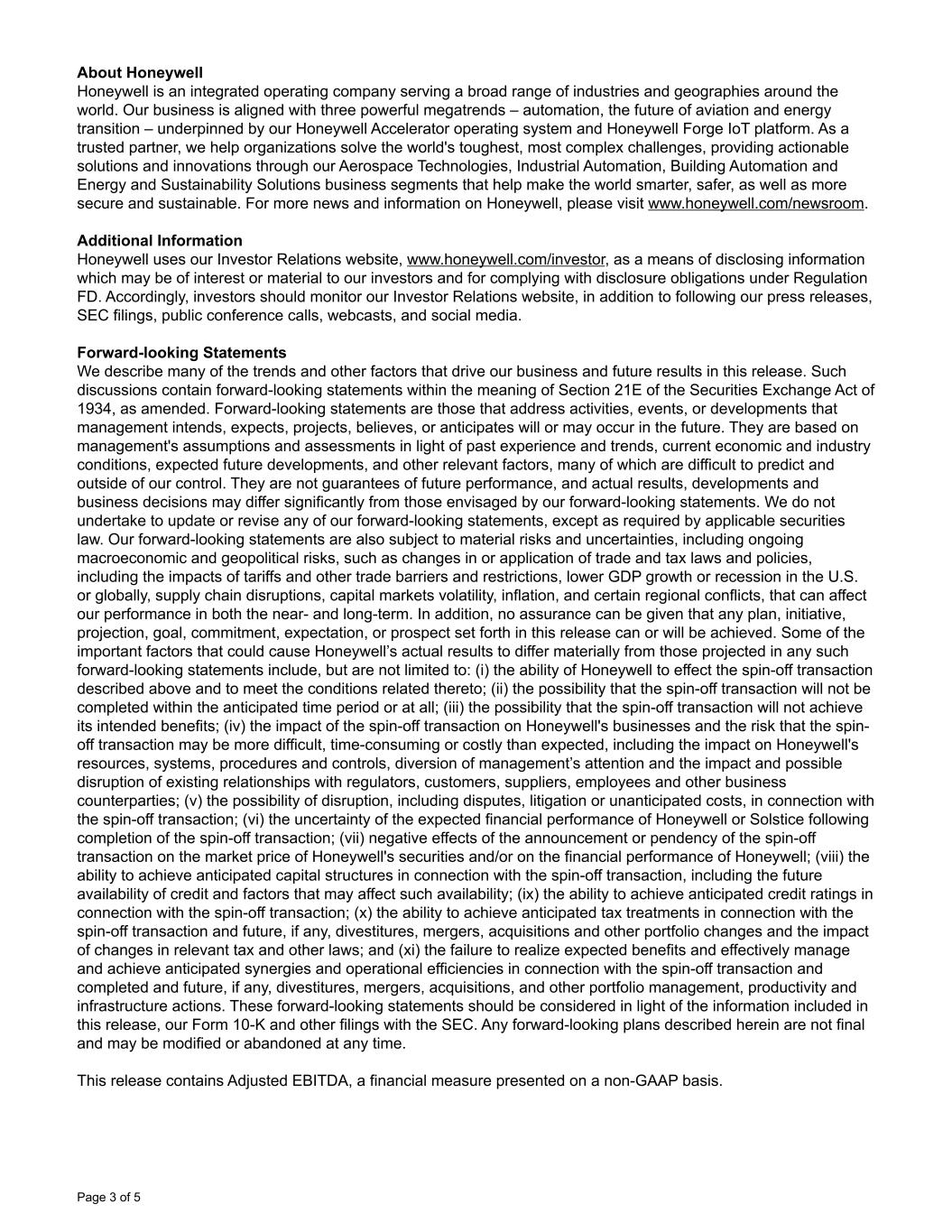 About Honeywell Honeywell is an integrated operating company serving a broad range of industries and geographies around the world. Our business is aligned with three powerful megatrends – automation, the future of aviation and energy transition – underpinned by our Honeywell Accelerator operating system and Honeywell Forge IoT platform. As a trusted partner, we help organizations solve the world's toughest, most complex challenges, providing actionable solutions and innovations through our Aerospace Technologies, Industrial Automation, Building Automation and Energy and Sustainability Solutions business segments that help make the world smarter, safer, as well as more secure and sustainable. For more news and information on Honeywell, please visit www.honeywell.com/newsroom. Additional Information Honeywell uses our Investor Relations website, www.honeywell.com/investor, as a means of disclosing information which may be of interest or material to our investors and for complying with disclosure obligations under Regulation FD. Accordingly, investors should monitor our Investor Relations website, in addition to following our press releases, SEC filings, public conference calls, webcasts, and social media. Forward-looking Statements We describe many of the trends and other factors that drive our business and future results in this release. Such discussions contain forward-looking statements within the meaning of Section 21E of the Securities Exchange Act of 1934, as amended. Forward-looking statements are those that address activities, events, or developments that management intends, expects, projects, believes, or anticipates will or may occur in the future. They are based on management's assumptions and assessments in light of past experience and trends, current economic and industry conditions, expected future developments, and other relevant factors, many of which are difficult to predict and outside of our control. They are not guarantees of future performance, and actual results, developments and business decisions may differ significantly from those envisaged by our forward-looking statements. We do not undertake to update or revise any of our forward-looking statements, except as required by applicable securities law. Our forward-looking statements are also subject to material risks and uncertainties, including ongoing macroeconomic and geopolitical risks, such as changes in or application of trade and tax laws and policies, including the impacts of tariffs and other trade barriers and restrictions, lower GDP growth or recession in the U.S. or globally, supply chain disruptions, capital markets volatility, inflation, and certain regional conflicts, that can affect our performance in both the near- and long-term. In addition, no assurance can be given that any plan, initiative, projection, goal, commitment, expectation, or prospect set forth in this release can or will be achieved. Some of the important factors that could cause Honeywell’s actual results to differ materially from those projected in any such forward-looking statements include, but are not limited to: (i) the ability of Honeywell to effect the spin-off transaction described above and to meet the conditions related thereto; (ii) the possibility that the spin-off transaction will not be completed within the anticipated time period or at all; (iii) the possibility that the spin-off transaction will not achieve its intended benefits; (iv) the impact of the spin-off transaction on Honeywell's businesses and the risk that the spin- off transaction may be more difficult, time-consuming or costly than expected, including the impact on Honeywell's resources, systems, procedures and controls, diversion of management’s attention and the impact and possible disruption of existing relationships with regulators, customers, suppliers, employees and other business counterparties; (v) the possibility of disruption, including disputes, litigation or unanticipated costs, in connection with the spin-off transaction; (vi) the uncertainty of the expected financial performance of Honeywell or Solstice following completion of the spin-off transaction; (vii) negative effects of the announcement or pendency of the spin-off transaction on the market price of Honeywell's securities and/or on the financial performance of Honeywell; (viii) the ability to achieve anticipated capital structures in connection with the spin-off transaction, including the future availability of credit and factors that may affect such availability; (ix) the ability to achieve anticipated credit ratings in connection with the spin-off transaction; (x) the ability to achieve anticipated tax treatments in connection with the spin-off transaction and future, if any, divestitures, mergers, acquisitions and other portfolio changes and the impact of changes in relevant tax and other laws; and (xi) the failure to realize expected benefits and effectively manage and achieve anticipated synergies and operational efficiencies in connection with the spin-off transaction and completed and future, if any, divestitures, mergers, acquisitions, and other portfolio management, productivity and infrastructure actions. These forward-looking statements should be considered in light of the information included in this release, our Form 10-K and other filings with the SEC. Any forward-looking plans described herein are not final and may be modified or abandoned at any time. This release contains Adjusted EBITDA, a financial measure presented on a non-GAAP basis. Page 3 of 5