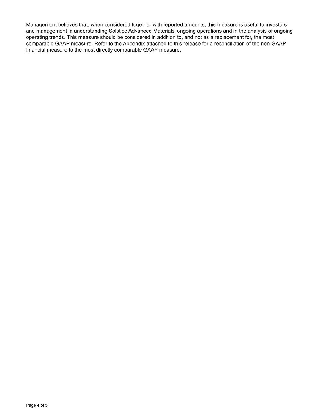 Management believes that, when considered together with reported amounts, this measure is useful to investors and management in understanding Solstice Advanced Materials’ ongoing operations and in the analysis of ongoing operating trends. This measure should be considered in addition to, and not as a replacement for, the most comparable GAAP measure. Refer to the Appendix attached to this release for a reconciliation of the non-GAAP financial measure to the most directly comparable GAAP measure. Page 4 of 5