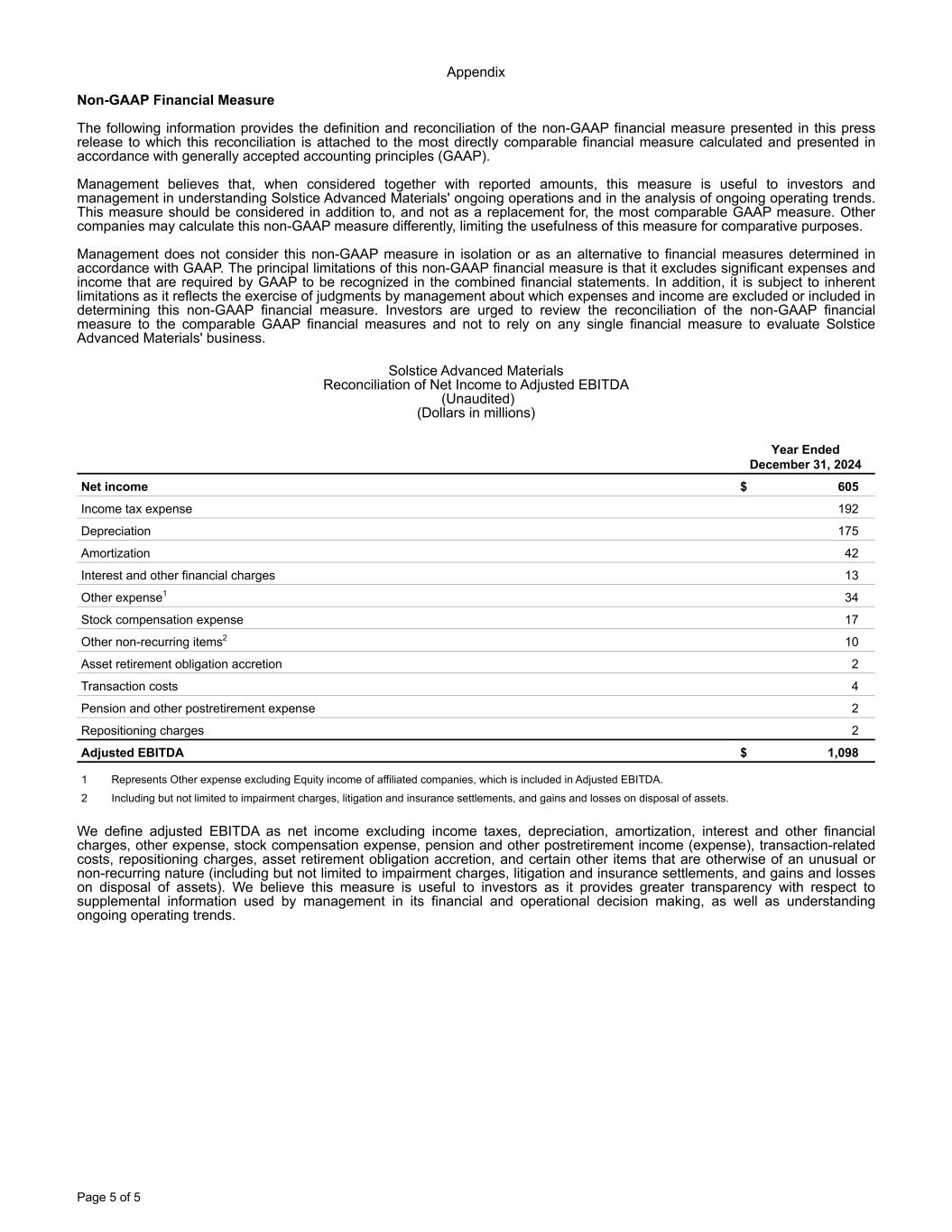Appendix Non-GAAP Financial Measure The following information provides the definition and reconciliation of the non-GAAP financial measure presented in this press release to which this reconciliation is attached to the most directly comparable financial measure calculated and presented in accordance with generally accepted accounting principles (GAAP). Management believes that, when considered together with reported amounts, this measure is useful to investors and management in understanding Solstice Advanced Materials' ongoing operations and in the analysis of ongoing operating trends. This measure should be considered in addition to, and not as a replacement for, the most comparable GAAP measure. Other companies may calculate this non-GAAP measure differently, limiting the usefulness of this measure for comparative purposes. Management does not consider this non-GAAP measure in isolation or as an alternative to financial measures determined in accordance with GAAP. The principal limitations of this non-GAAP financial measure is that it excludes significant expenses and income that are required by GAAP to be recognized in the combined financial statements. In addition, it is subject to inherent limitations as it reflects the exercise of judgments by management about which expenses and income are excluded or included in determining this non-GAAP financial measure. Investors are urged to review the reconciliation of the non-GAAP financial measure to the comparable GAAP financial measures and not to rely on any single financial measure to evaluate Solstice Advanced Materials' business. Solstice Advanced Materials Reconciliation of Net Income to Adjusted EBITDA (Unaudited) (Dollars in millions) Year Ended December 31, 2024 Net income $ 605 Income tax expense 192 Depreciation 175 Amortization 42 Interest and other financial charges 13 Other expense1 34 Stock compensation expense 17 Other non-recurring items2 10 Asset retirement obligation accretion 2 Transaction costs 4 Pension and other postretirement expense 2 Repositioning charges 2 Adjusted EBITDA $ 1,098 1 Represents Other expense excluding Equity income of affiliated companies, which is included in Adjusted EBITDA. 2 Including but not limited to impairment charges, litigation and insurance settlements, and gains and losses on disposal of assets. We define adjusted EBITDA as net income excluding income taxes, depreciation, amortization, interest and other financial charges, other expense, stock compensation expense, pension and other postretirement income (expense), transaction-related costs, repositioning charges, asset retirement obligation accretion, and certain other items that are otherwise of an unusual or non-recurring nature (including but not limited to impairment charges, litigation and insurance settlements, and gains and losses on disposal of assets). We believe this measure is useful to investors as it provides greater transparency with respect to supplemental information used by management in its financial and operational decision making, as well as understanding ongoing operating trends. Page 5 of 5