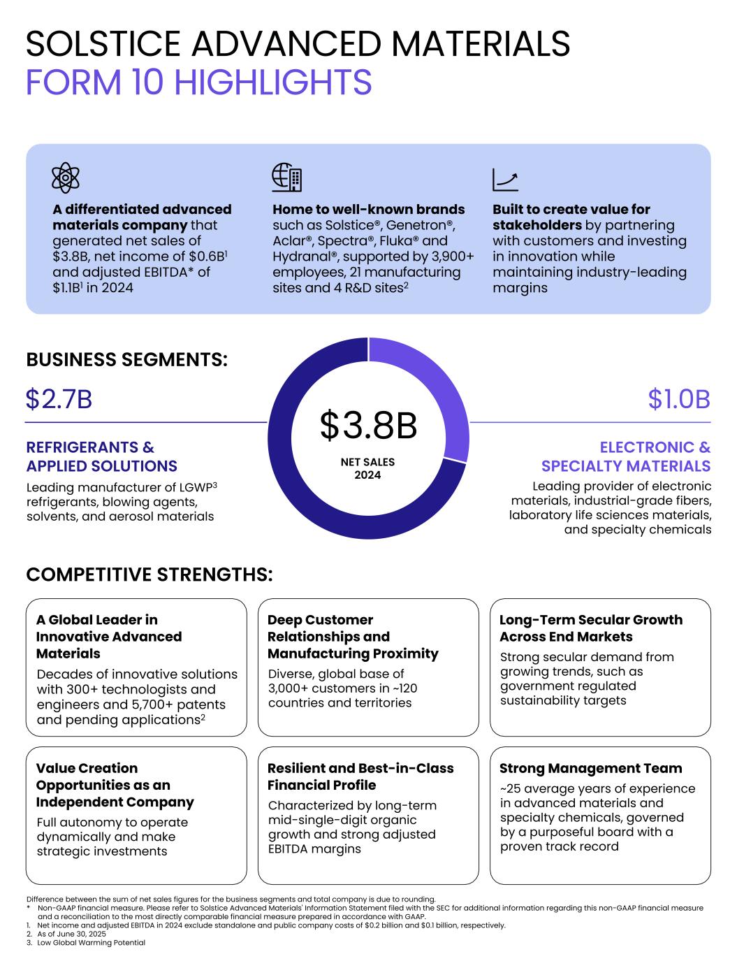 A differentiated advanced materials company that generated net sales of $3.8B, net income of $0.6B1 and adjusted EBITDA* of $1.1B1 in 2024 Home to well-known brands such as Solstice®, Genetron®, Aclar®, Spectra®, Fluka® and Hydranal®, supported by 3,900+ employees, 21 manufacturing sites and 4 R&D sites2 Built to create value for stakeholders by partnering with customers and investing in innovation while maintaining industry-leading margins BUSINESS SEGMENTS: REFRIGERANTS & APPLIED SOLUTIONS ELECTRONIC & SPECIALTY MATERIALS Leading manufacturer of LGWP3 refrigerants, blowing agents, solvents, and aerosol materials Leading provider of electronic materials, industrial-grade fibers, laboratory life sciences materials, and specialty chemicals COMPETITIVE STRENGTHS: A Global Leader in Innovative Advanced Materials Decades of innovative solutions with 300+ technologists and engineers and 5,700+ patents and pending applications2 Deep Customer Relationships and Manufacturing Proximity Diverse, global base of 3,000+ customers in ~120 countries and territories Long-Term Secular Growth Across End Markets Strong secular demand from growing trends, such as government regulated sustainability targets Value Creation Opportunities as an Independent Company Full autonomy to operate dynamically and make strategic investments Resilient and Best-in-Class Financial Profile Characterized by long-term mid-single-digit organic growth and strong adjusted EBITDA margins Strong Management Team ~25 average years of experience in advanced materials and specialty chemicals, governed by a purposeful board with a proven track record NET SALES 2024 Difference between the sum of net sales figures for the business segments and total company is due to rounding. * Non-GAAP financial measure. Please refer to Solstice Advanced Materials' Information Statement filed with the SEC for additional information regarding this non-GAAP financial measure and a reconciliation to the most directly comparable financial measure prepared in accordance with GAAP. 1. Net income and adjusted EBITDA in 2024 exclude standalone and public company costs of $0.2 billion and $0.1 billion, respectively. 2. As of June 30, 2025 3. Low Global Warming Potential