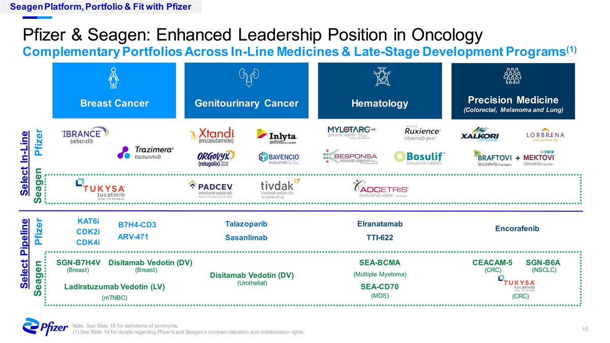 Seagen Platform, Portfolio & Fit with Pfizer Seagen In-Line Portfolio Across a Range of Tumor Types 4 Approved Products with Active Lifecycles Best-in-Class TKI for Foundation of care and First- First-in-Class ADC for Locally HER2+ Breast Cancer and First First-in-Class ADC for Overview in-Class ADC in multiple CD30 Advanced & Metastatic FDA-approved treatment in Cervical Cancer Expressing Lymphomas Urothelial Cancer HER2+ mCRC (1) Seagen Rights US and Canada Global 50/50 US, Canada and EU Global 50/50 | (ex-China) Year Approved 2011 2019 2020 2021 2022A Sales $0.8B $0.5B $0.4B $0.1B Key Lifecycle 1L cisplatin-ineligible Value Drivers 1L+ HER2+ mBC mUC (2023 PDUFA) 1L mCC 1L HER2+ BC maint. 3L+ DLBCL 1L mUC 1L HNSCC 1L HER2+ mCRC NMIBC / MIBC (2),(3) Seagen anticipates 2023 revenue of ~$2.2 billion Source: Pfizer analysis and Public Company Filings. Note: See Slide 18 for definitions of acronyms. Note: Sales figures represent revenues booked in Seagen commercialization territories. (1) See Slide 19 for details regarding Seagen’s development and commercialization rights. (2) Mid-point of range of ~$2.14 – $2.24 billion as provided by Seagen in its Fourth Quarter earnings release dated 2/15/23. (3) Note that Seagen’s revenue definition differs from Pfizer’s (Pfizer does not include royalties or milestones in its revenues). 9