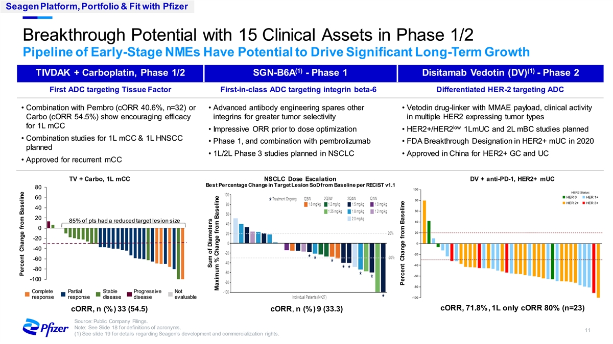 Seagen Platform, Portfolio & Fit with Pfizer Pfizer & Seagen: Enhanced Leadership Position in Oncology (1) Complementary Portfolios Across In-Line Medicines & Late-Stage Development Programs Precision Medicine Breast Cancer Genitourinary Cancer Hematology (Colorectal, Melanoma and Lung) + KAT6i Talazoparib Elranatamab B7H4-CD3 Encorafenib CDK2i ARV-471 Sasanlimab TTI-622 CDK4i SGN-B7H4V Disitamab Vedotin (DV) SEA-BCMA CEACAM-5 SGN-B6A (Breast) (Breast) (CRC) (NSCLC) (Multiple Myeloma) Disitamab Vedotin (DV) (Urothelial) Ladiratuzumab Vedotin (LV) SEA-CD70 (MDS) (CRC) (mTNBC) Note: See Slide 18 for definitions of acronyms. 10 (1) See Slide 19 for details regarding Pfizer’s and Seagen’s commercialization and collaboration rights. Select Pipeline Select In-Line Seagen Seagen Pfizer Pfizer