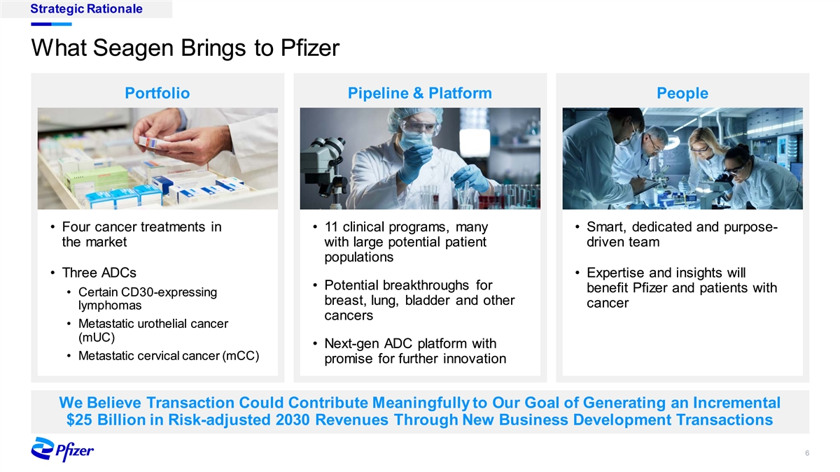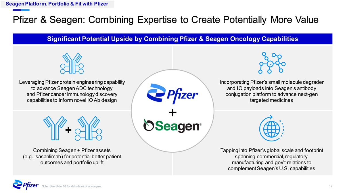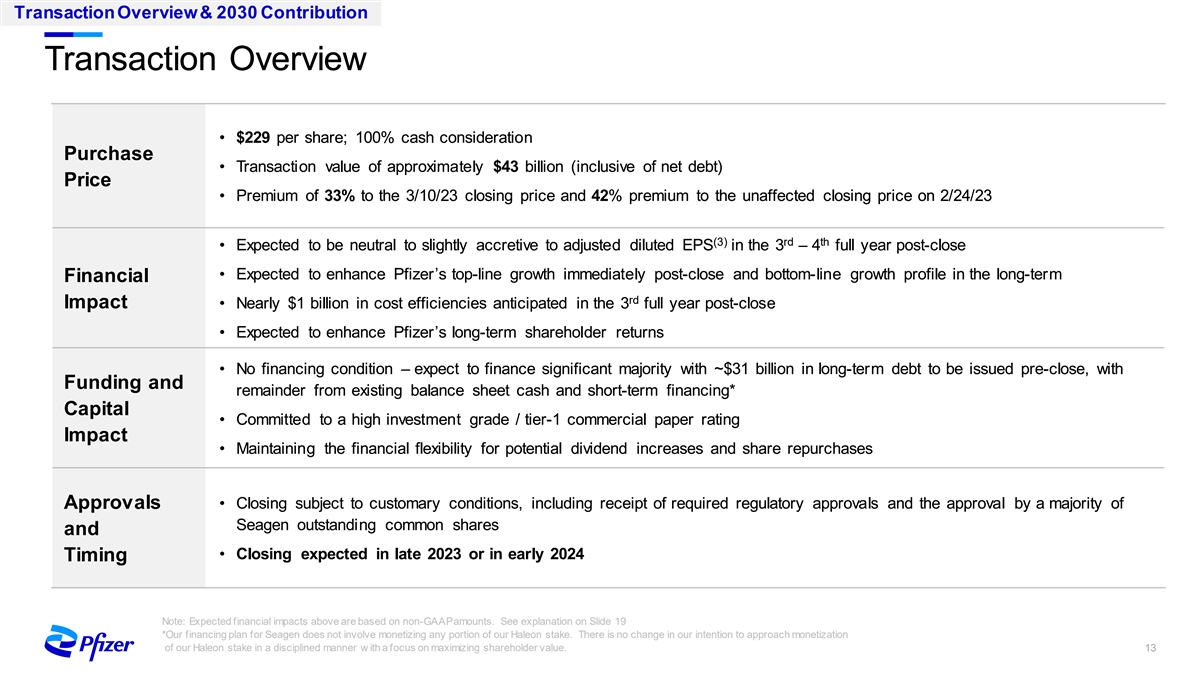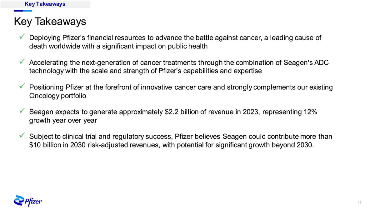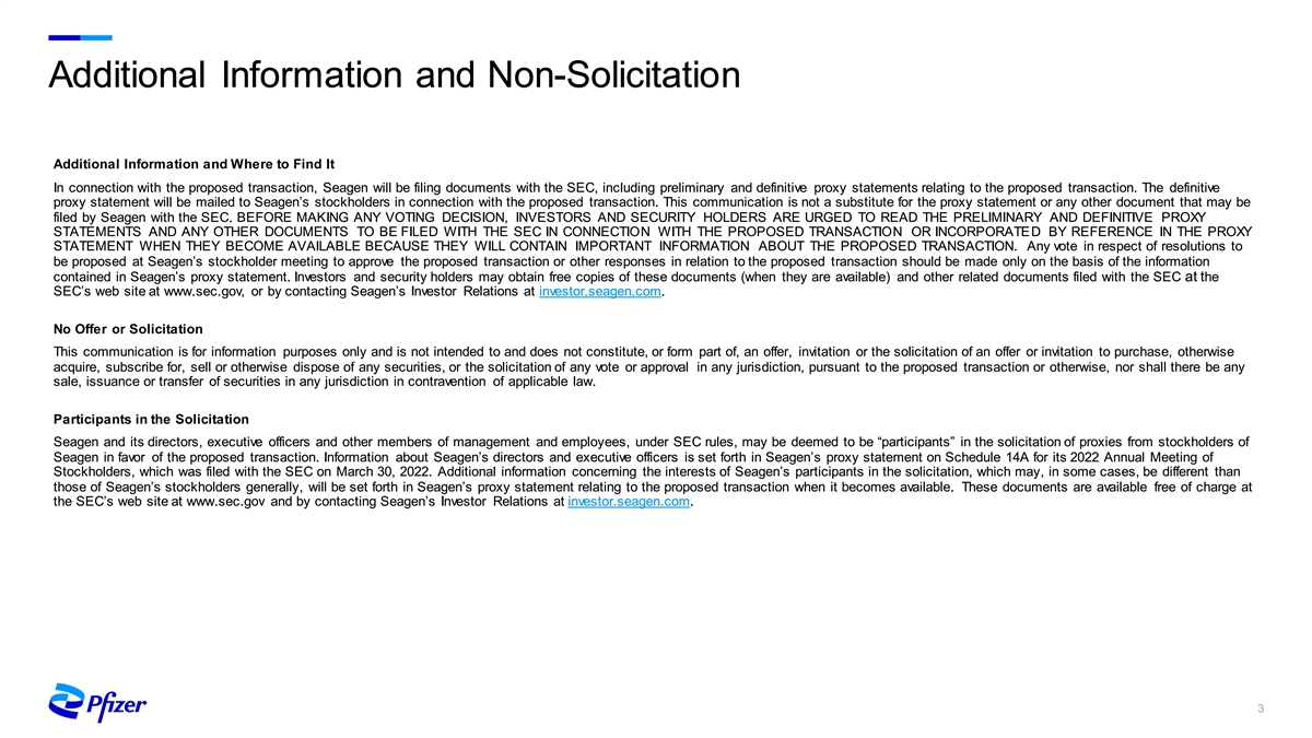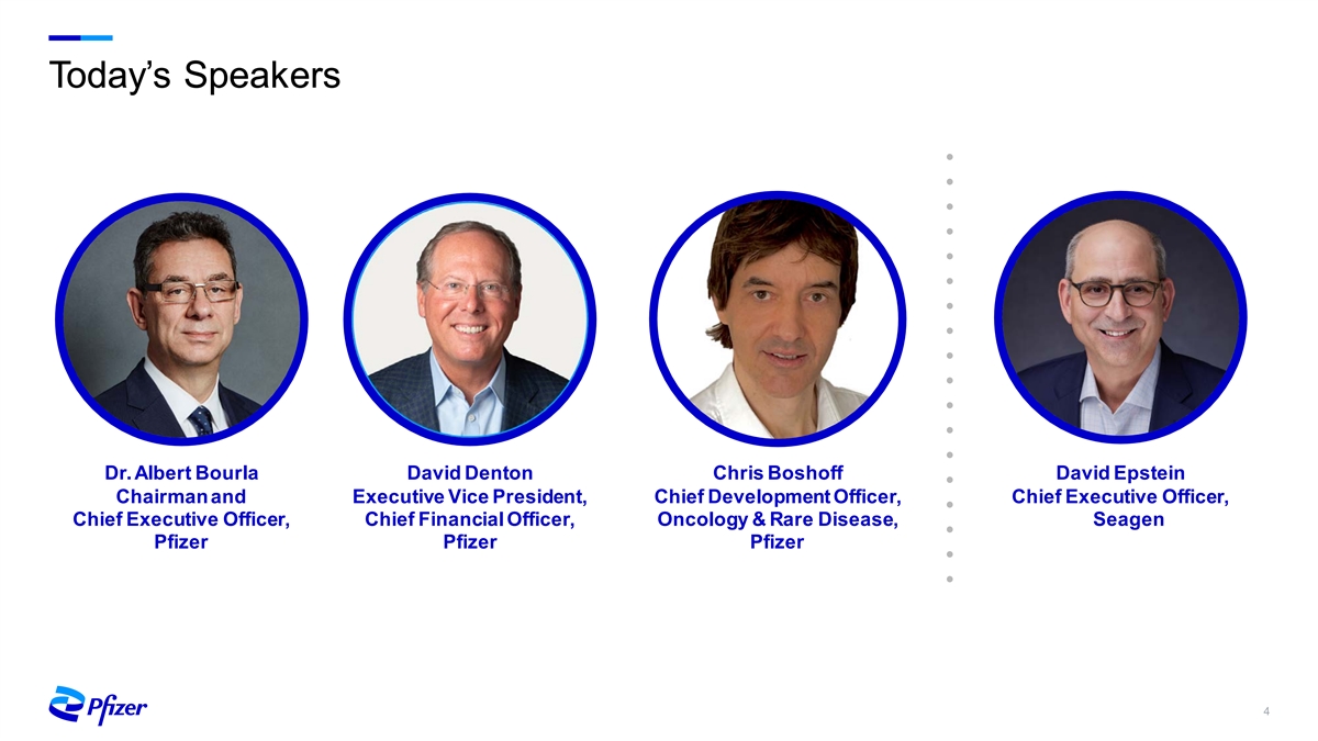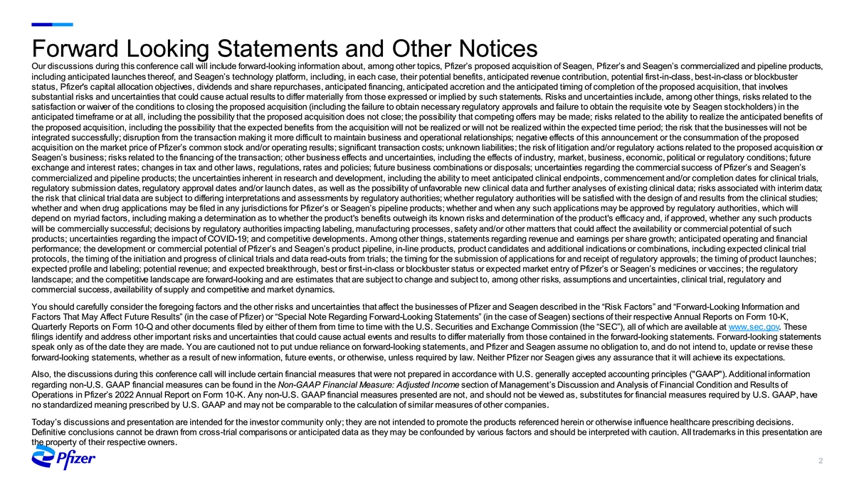 Forward Looking Statements and Other Notices Our discussions during this conference call will include forward-looking information about, among other topics, Pfizer’s proposed acquisition of Seagen, Pfizer’s and Seagen’s commercialized and pipeline products, including anticipated launches thereof, and Seagen’s technology platform, including, in each case, their potential benefits, anticipated revenue contribution, potential first-in-class, best-in-class or blockbuster status, Pfizer's capital allocation objectives, dividends and share repurchases, anticipated financing, anticipated accretion and the anticipated timing of completion of the proposed acquisition, that involves substantial risks and uncertainties that could cause actual results to differ materially from those expressed or implied by such statements. Risks and uncertainties include, among other things, risks related to the satisfaction or waiver of the conditions to closing the proposed acquisition (including the failure to obtain necessary regulatory approvals and failure to obtain the requisite vote by Seagen stockholders) in the anticipated timeframe or at all, including the possibility that the proposed acquisition does not close; the possibility that competing offers may be made; risks related to the ability to realize the anticipated benefits of the proposed acquisition, including the possibility that the expected benefits from the acquisition will not be realized or will not be realized within the expected time period; the risk that the businesses will not be integrated successfully; disruption from the transaction making it more difficult to maintain business and operational relationships; negative effects of this announcement or the consummation of the proposed acquisition on the market price of Pfizer’s common stock and/or operating results; significant transaction costs; unknown liabilities; the risk of litigation and/or regulatory actions related to the proposed acquisition or Seagen’s business; risks related to the financing of the transaction; other business effects and uncertainties, including the effects of industry, market, business, economic, political or regulatory conditions; future exchange and interest rates; changes in tax and other laws, regulations, rates and policies; future business combinations or disposals; uncertainties regarding the commercial success of Pfizer’s and Seagen’s commercialized and pipeline products; the uncertainties inherent in research and development, including the ability to meet anticipated clinical endpoints, commencement and/or completion dates for clinical trials, regulatory submission dates, regulatory approval dates and/or launch dates, as well as the possibility of unfavorable new clinical data and further analyses of existing clinical data; risks associated with interim data; the risk that clinical trial data are subject to differing interpretations and assessments by regulatory authorities; whether regulatory authorities will be satisfied with the design of and results from the clinical studies; whether and when drug applications may be filed in any jurisdictions for Pfizer’s or Seagen’s pipeline products; whether and when any such applications may be approved by regulatory authorities, which will depend on myriad factors, including making a determination as to whether the product's benefits outweigh its known risks and determination of the product's efficacy and, if approved, whether any such products will be commercially successful; decisions by regulatory authorities impacting labeling, manufacturing processes, safety and/or other matters that could affect the availability or commercial potential of such products; uncertainties regarding the impact of COVID-19; and competitive developments. Among other things, statements regarding revenue and earnings per share growth; anticipated operating and financial performance; the development or commercial potential of Pfizer’s and Seagen’s product pipeline, in-line products, product candidates and additional indications or combinations, including expected clinical trial protocols, the timing of the initiation and progress of clinical trials and data read-outs from trials; the timing for the submission of applications for and receipt of regulatory approvals; the timing of product launches; expected profile and labeling; potential revenue; and expected breakthrough, best or first-in-class or blockbuster status or expected market entry of Pfizer’s or Seagen’s medicines or vaccines; the regulatory landscape; and the competitive landscape are forward-looking and are estimates that are subject to change and subject to, among other risks, assumptions and uncertainties, clinical trial, regulatory and commercial success, availability of supply and competitive and market dynamics. You should carefully consider the foregoing factors and the other risks and uncertainties that affect the businesses of Pfizer and Seagen described in the “Risk Factors” and “Forward-Looking Information and Factors That May Affect Future Results” (in the case of Pfizer) or “Special Note Regarding Forward-Looking Statements” (in the case of Seagen) sections of their respective Annual Reports on Form 10-K, Quarterly Reports on Form 10-Q and other documents filed by either of them from time to time with the U.S. Securities and Exchange Commission (the “SEC”), all of which are available at www.sec.gov. These filings identify and address other important risks and uncertainties that could cause actual events and results to differ materially from those contained in the forward-looking statements. Forward-looking statements speak only as of the date they are made. You are cautioned not to put undue reliance on forward-looking statements, and Pfizer and Seagen assume no obligation to, and do not intend to, update or revise these forward-looking statements, whether as a result of new information, future events, or otherwise, 