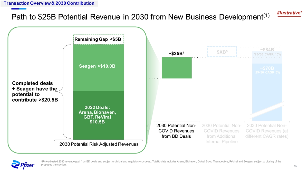 Transaction Overview & 2030 Contribution Illustrative* Strengthens Pfizer's Long-Term Growth Plans Seagen expects to generate revenue of more than $2B in 2023. Pfizer believes Seagen could contribute more than $10B to 2030 risk adjusted revenues, subject to clinical and regulatory success ~$84B 5 4 $XB ~$25B '25-'30 CAGR 10% 1 ~$52B ~$70B '22-'25 CAGR 6% '25-'30 CAGR 6% 3 with new launches ~$20B 2 ~$17B New launches Current products *For illustrative purposes only and not intended to be at scale. All values at constant exchange rates. Note: See slide 19 for acronym definitions 1 Assumes actual 2022 non-COVID revenues ($43.6B) and 2022-2025 CAGR of 6%. Excludes 2022-2025 BD. 2 Internal expected negative LOE impact from products w ith a 2021 total revenue base of $18B as show n in Pfizer’s Q4 2022 earnings slide 36. 3 Internal 2030 risk-adjusted revenue expectations for NME and new indications launches, excluding COVID-19 vaccine BA.4/BA.5 variant, as show n in NME Launches and New Indications sections in Pfizer’s Q4 2022 earnings slide 37. 4 Risk-adjusted 2030 revenue goal from BD deals. 5 Potential 2030 risk-adjusted revenues for new product launches as show n in the appendix in Pfizer’s Q4 2022 earnings call slide 38. 14 Note: Preliminary, subject to change, and subject to, among other risks, assumptions and uncertainties, clinical trial, regulatory and commercial success and availability of supply. LOE=Loss of Exclusivity; NME=New Molecular Entity; BD=Business Development