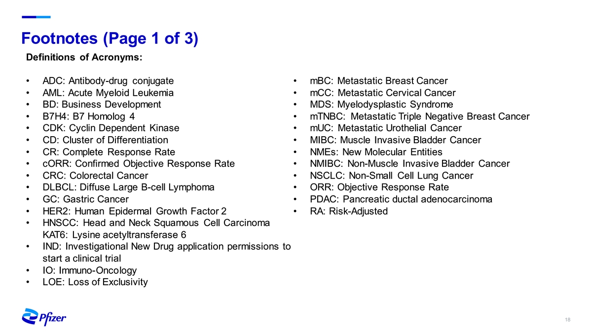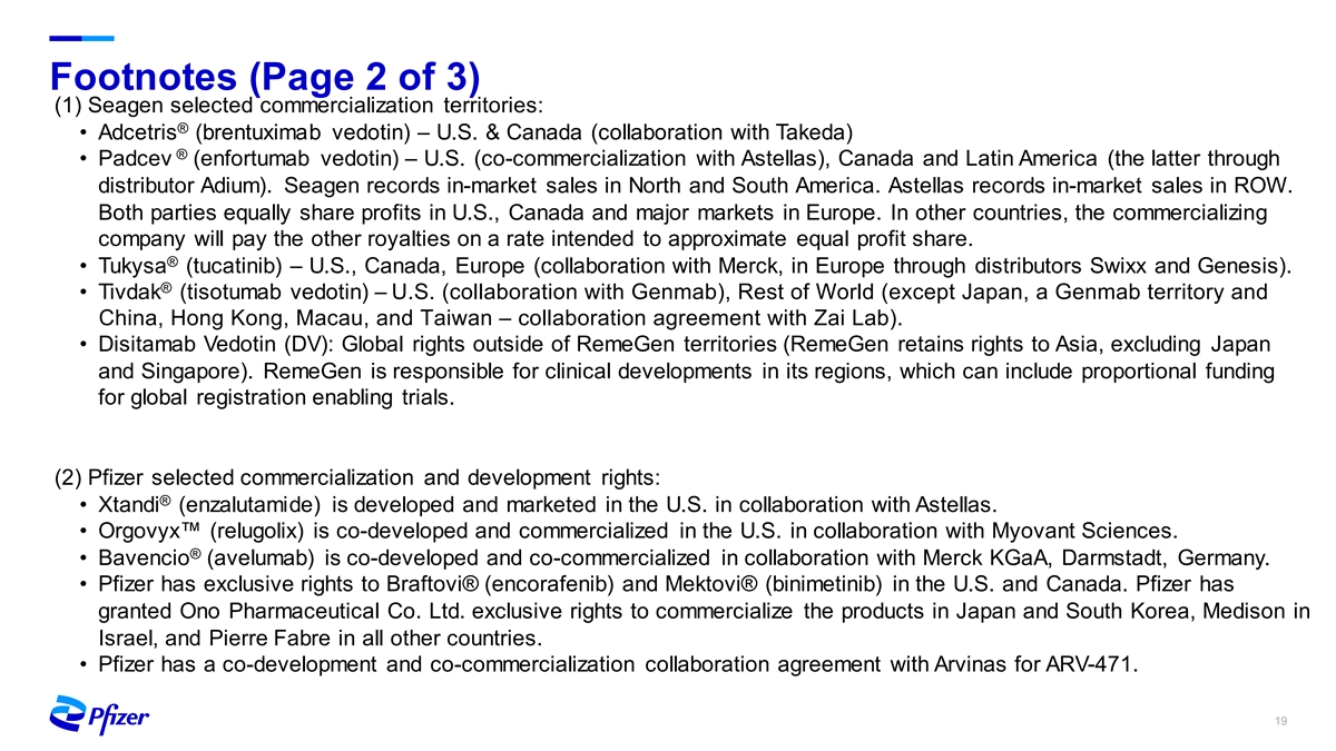 Footnotes (Page 2 of 3) (1) Seagen selected commercialization territories: ® • Adcetris (brentuximab vedotin) – U.S. & Canada (collaboration with Takeda) ® • Padcev (enfortumab vedotin) – U.S. (co-commercialization with Astellas), Canada and Latin America (the latter through distributor Adium). Seagen records in-market sales in North and South America. Astellas records in -market sales in ROW. Both parties equally share profits in U.S., Canada and major markets in Europe. In other countries, the commercializing company will pay the other royalties on a rate intended to approximate equal profit share. ® • Tukysa (tucatinib) – U.S., Canada, Europe (collaboration with Merck, in Europe through distributors S wixx and Genesis). ® • Tivdak (tisotumab vedotin) – U.S. (collaboration with Genmab), Rest of World (except Japan, a Genmab territory and China, Hong Kong, Macau, and Taiwan – collaboration agreement with Zai Lab). • Disitamab Vedotin (DV): Global rights outside ofR emeGen territories (RemeGen retains rights to Asia, excluding Japan and Singapore). RemeGen is responsible for clinical developments in its regions, which can include proportional funding for global registration enabling trials. (2) Pfizer selected commercialization and development rights: ® • Xtandi (enzalutamide) is developed and marketed in the U.S. in collaboration with Astellas. • Orgovyx™ (relugolix) is co-developed and commercialized in the U.S. in collaboration witM h yovant Sciences. ® • Bavencio (avelumab) is co-developed and co-commercialized in collaboration with Merck KGaA, Darmstadt, Germany. • Pfizer has exclusive rights toBra ftovi® (encorafenib) and Mektovi® (binimetinib) in the U.S. and Canada. Pfizer has granted Ono Pharmaceutical Co. Ltd. exclusive rights to commercialize the products in Japan and South Korea, M edison in Israel, and Pierre Fabre in all other countries. • Pfizer has a co-development and co -commercialization collaboration agreement with Arvinas for ARV -471. 19