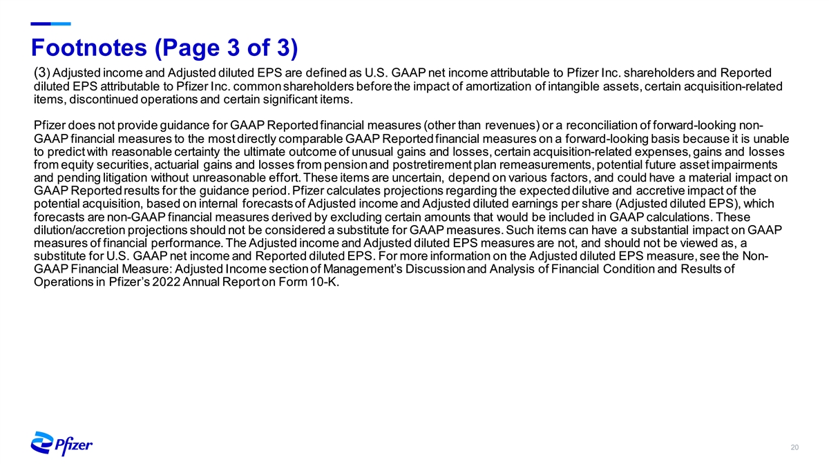 Footnotes (Page 3 of 3) (3) Adjusted income and Adjusted diluted EPS are defined as U.S. GAAP net income attributable to Pfizer Inc. shareholders and Reported diluted EPS attributable to Pfizer Inc. common shareholders before the impact of amortization of intangible assets, certain acquisition-related items, discontinued operations and certain significant items. Pfizer does not provide guidance for GAAP Reported financial measures (other than revenues) or a reconciliation of forward-looking non- GAAP financial measures to the most directly comparable GAAP Reported financial measures on a forward-looking basis because it is unable to predict with reasonable certainty the ultimate outcome of unusual gains and losses, certain acquisition-related expenses, gains and losses from equity securities, actuarial gains and losses from pension and postretirement plan remeasurements, potential future asset impairments and pending litigation without unreasonable effort. These items are uncertain, depend on various factors, and could have a material impact on GAAP Reported results for the guidance period. Pfizer calculates projections regarding the expected dilutive and accretive impact of the potential acquisition, based on internal forecasts of Adjusted income and Adjusted diluted earnings per share (Adjusted diluted EPS), which forecasts are non-GAAP financial measures derived by excluding certain amounts that would be included in GAAP calculations. These dilution/accretion projections should not be considered a substitute for GAAP measures. Such items can have a substantial impact on GAAP measures of financial performance. The Adjusted income and Adjusted diluted EPS measures are not, and should not be viewed as, a substitute for U.S. GAAP net income and Reported diluted EPS. For more information on the Adjusted diluted EPS measure, see the Non- GAAP Financial Measure: Adjusted Income section of Management’s Discussion and Analysis of Financial Condition and Results of Operations in Pfizer’s 2022 Annual Report on Form 10-K. 20