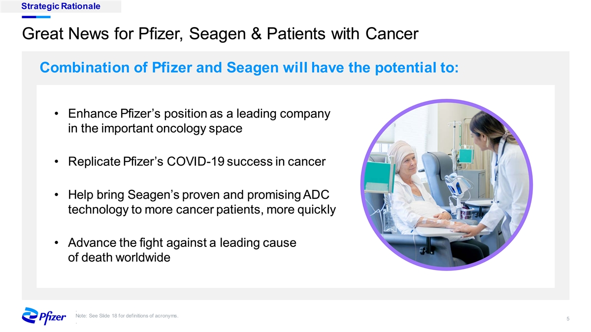 Today’s Speakers Dr. Albert Bourla David Denton Chris Boshoff David Epstein Chairman and Executive Vice President, Chief Development Officer, Chief Executive Officer, Chief Executive Officer, Chief Financial Officer, Oncology & Rare Disease, Seagen Pfizer Pfizer Pfizer 4