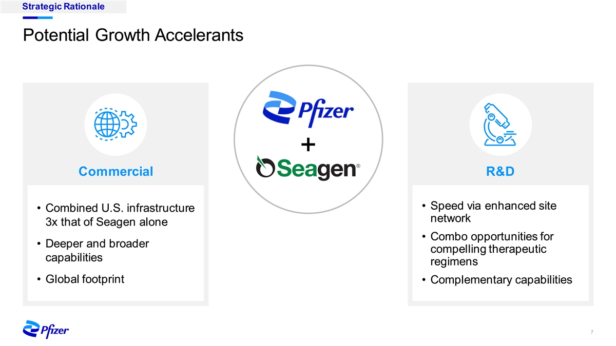 Strategic Rationale What Seagen Brings to Pfizer Portfolio Pipeline & Platform People • Four cancer treatments in • 11 clinical programs, many • Smart, dedicated and purpose- the market with large potential patient driven team populations • Three ADCs • Expertise and insights will • Potential breakthroughs for benefit Pfizer and patients with • Certain CD30-expressing breast, lung, bladder and other cancer lymphomas cancers • Metastatic urothelial cancer (mUC) • Next-gen ADC platform with • Metastatic cervical cancer (mCC) promise for further innovation We Believe Transaction Could Contribute Meaningfully to Our Goal of Generating an Incremental $25 Billion in Risk-adjusted 2030 Revenues Through New Business Development Transactions 6