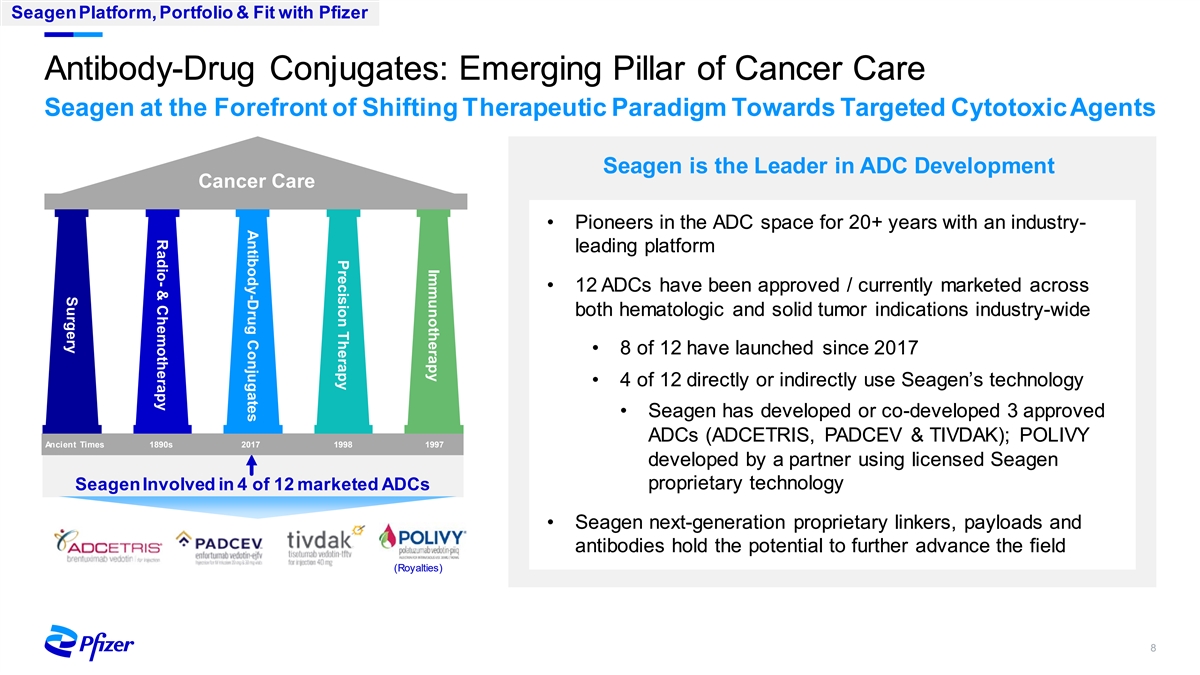 Strategic Rationale Potential Growth Accelerants + Commercial R&D • Speed via enhanced site • Combined U.S. infrastructure network 3x that of Seagen alone • Combo opportunities for • Deeper and broader compelling therapeutic capabilities regimens • Global footprint • Complementary capabilities 7
