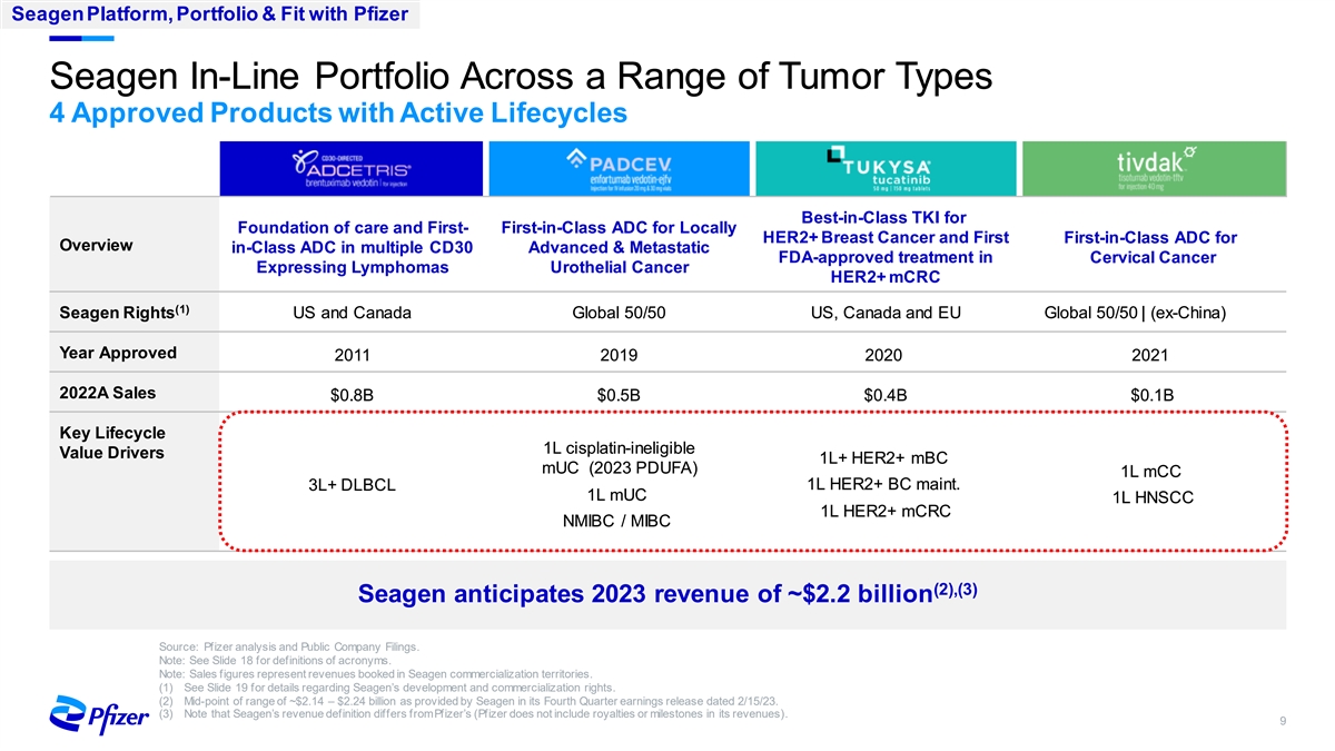 Immunotherapy Precision Therapy Antibody-Drug Conjugates Radio- & Chemotherapy Surgery Seagen Platform, Portfolio & Fit with Pfizer Antibody-Drug Conjugates: Emerging Pillar of Cancer Care Seagen at the Forefront of Shifting Therapeutic Paradigm Towards Targeted Cytotoxic Agents Seagen is the Leader in ADC Development Cancer Care • Pioneers in the ADC space for 20+ years with an industry- leading platform • 12 ADCs have been approved / currently marketed across both hematologic and solid tumor indications industry-wide • 8 of 12 have launched since 2017 • 4 of 12 directly or indirectly use Seagen’s technology • Seagen has developed or co-developed 3 approved ADCs (ADCETRIS, PADCEV & TIVDAK); POLIVY Ancient Times 1890s 2017 1998 1997 developed by a partner using licensed Seagen Seagen Involved in 4 of 12 marketed ADCs proprietary technology • Seagen next-generation proprietary linkers, payloads and antibodies hold the potential to further advance the field (Royalties) 8