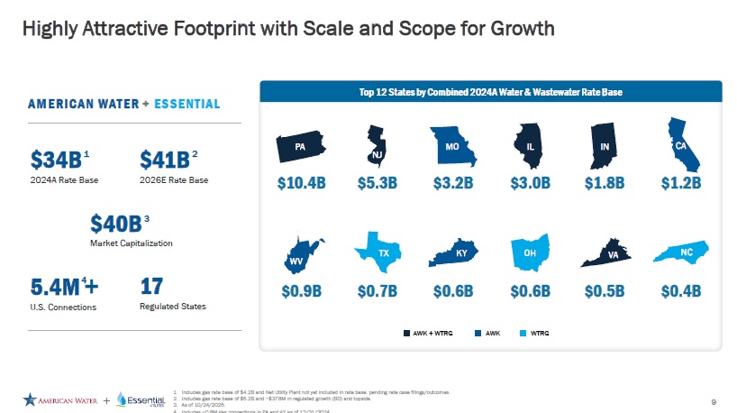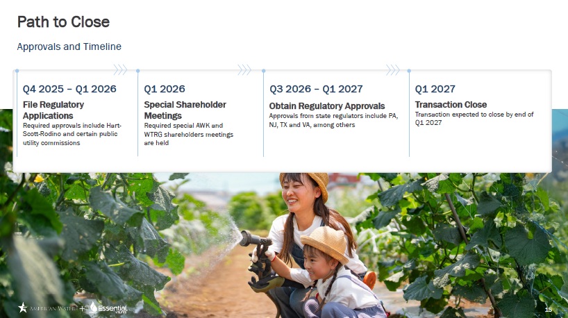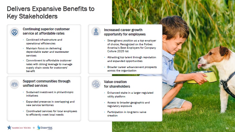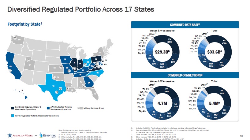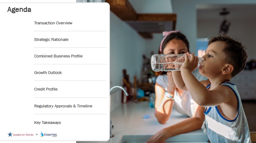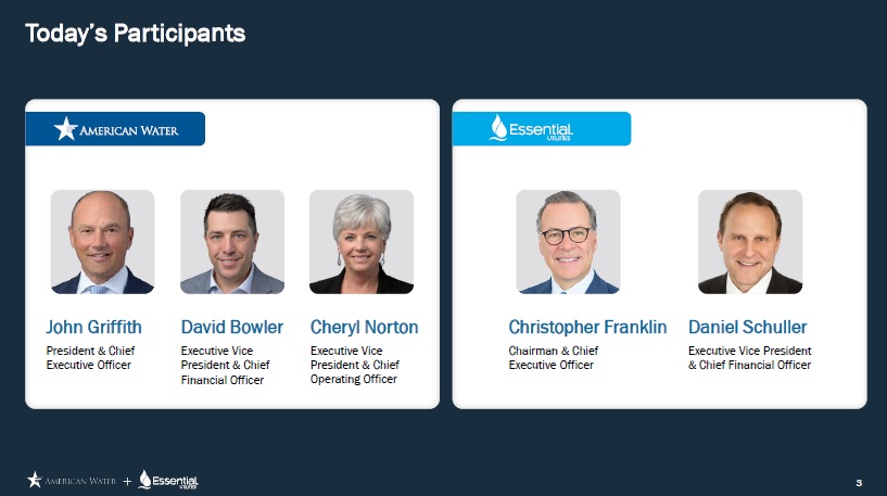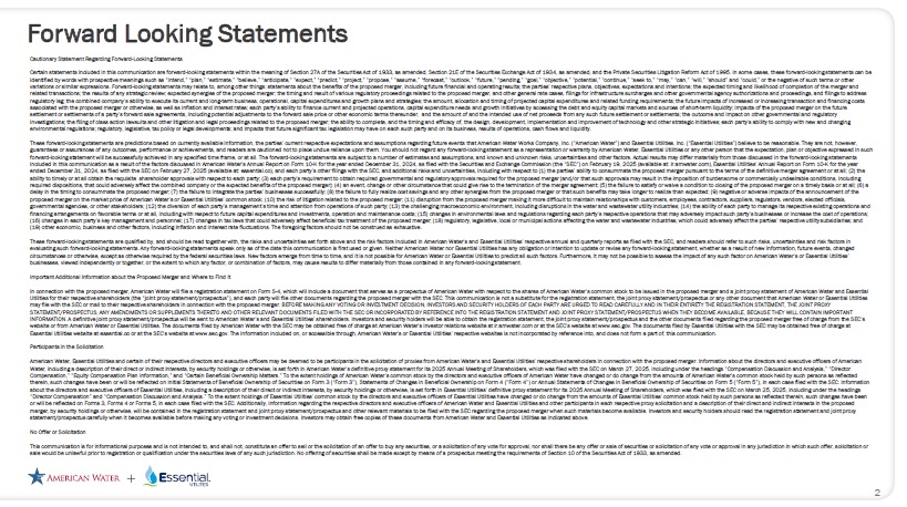 Forward Looking Statements Cautionary Statement Regarding Forward - Looking Statements Certain statements included in this communication are forward - looking statements within the meaning of Section 27A of the Securities Act of 1933, as amended, Section 21E of the Securities Exchange Act of 1934, as amended, and the Private Securities Litigation Reform Act of 1995. In some cases, these forward - looking statements can be identified by words with prospective meanings such as “intend,” “plan,” “estimate,” “believe,” “anticipate,” “expect,” “predict,” “project,” “propose,” “assume,” “forecast,” “outlook,” “future,” “pending,” “goal,” “objective,” “potential,” “continue,” “seek to,” “may,” “can,” “will,” “should” and “could,” or the negative of such terms or other variations or similar expressions. Forward - looking statements may relate to, among other things: statements about the benefits of the proposed merger, including future financial and operating results; the parties’ respective plans, objectives, expectations and intentions; the expected timing and likelihood of completion of the merger and related transactions; the results of any strategic review; expected synergies of the proposed merger; the timing and result of various regulatory proceedings related to the proposed merger, and other general rate cases, filings for infrastructure surcharges and other governmental agency authorizations and proceedings, and filings to address regulatory lag; the combined company’s ability to execute its current and long - term business, operational, capital expenditures and growth plans and strategies; the amount, allocation and timing of projected capital expenditures and related funding requirements; the future impacts of increased or increasing transaction and financing costs associated with the proposed merger or otherwise, as well as inflation and interest rates; each party’s ability to finance current and projected operations, capital expenditure needs and growth initiatives by accessing the debt and equity capital markets and sources of short - term liquidity; impacts of the proposed merger on the future settlement or settlements of a party’s forward sale agreements, including potential adjustments to the forward sale price or other economic terms thereunder, and the amount of and the intended use of net proceeds from any such future settlement or settlements; the outcome and impact on other governmental and regulatory investigations; the filing of class action lawsuits and other litigation and legal proceedings related to the proposed merger; the ability to complete, and the timing and efficacy of, the design, development, implementation and improvement of technology and other strategic initiatives; each party’s ability to comply with new and changing environmental regulations; regulatory, legislative, tax policy or legal developments; and impacts that future significant tax legislation may have on each such party and on its business, results of operations, cash flows and liquidity. These forward - looking statements are predictions based on currently available information, the parties’ current respective expectations and assumptions regarding future events that American Water Works Company, Inc. (“American Water”) and Essential Utilities, Inc. (“Essential Utilities”) believe to be reasonable. They are not, however, guarantees or assurances of any outcomes, performance or achievements, and readers are cautioned not to place undue reliance upon them. You should not regard any forward - looking statement as a representation or warranty by American Water, Essential Utilities or any other person that the expectation, plan or objective expressed in such forward - looking statement will be successfully achieved in any specified time frame, or at all. The forward - looking statements are subject to a number of estimates and assumptions, and known and unknown risks, uncertainties and other factors. Actual results may differ materially from those discussed in the forward - looking statements included in this communication as a result of the factors discussed in American Water’s Annual Report on Form 10 - K for the year ended December 31, 2024, as filed with the Securities and Exchange Commission (the “SEC”) on February 19, 2025 (available at: ir.amwater.com), Essential Utilities’ Annual Report on Form 10 - K for the year ended December 31, 2024, as filed with the SEC on February 27, 2025 (available at: essential.co), and each party’s other filings with the SEC, and additional risks and uncertainties, including with respect to (1) the parties’ ability to consummate the proposed merger pursuant to the terms of the definitive merger agreement or at all; (2) the ability to timely or at all obtain the requisite shareholder approvals with respect to each party; (3) each party’s requirement to obtain required governmental and regulatory approvals required for the proposed merger (and/or that such approvals may result in the imposition of burdensome or commercially undesirable conditions, including required dispositions, that could adversely affect the combined company or the expected benefits of the proposed merger); (4) an event, change or other circumstance that could give rise to the termination of the merger agreement; (5) the failure to satisfy or waive a condition to closing of the proposed merger on a timely basis or at all; (6) a delay in the timing to consummate the proposed merger; (7) the failure to integrate the parties’ businesses successfully; (8) the failure to fully realize cost savings and any other synergies from the proposed merger or that such benefits may take longer to realize than expected; (9) negative or adverse impacts of the announcement of the proposed merger on the market price of American Water’s or Essential Utilities’ common stock; (10) the