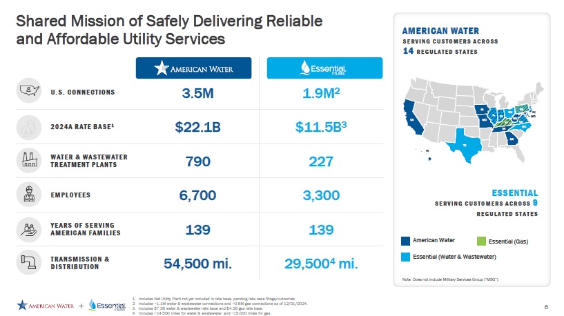 Uniting the Two Leading U.S. Water and Wastewater Utilities 1. Represents combined equity market capitalization as of 10/24/2025. Leadership John Griffith, President & Chief Executive Officer David Bowler, Executive Vice President & Chief Financial Officer Cheryl Norton, Executive Vice President & Chief Operating Officer Daniel Schuller, Executive Vice President & Chief Strategy Officer Colleen Arnold, President, Regulated Operations Michael Huwar, President of Peoples Natural Gas Tax - Free, All - Stock Merger $40B Market Cap 1 $63B Enterprise Value 1 Fixed Exchange Ratio: 0.305 AWK shares for each WTRG share Deal Structure Board Composition Karl Kurz, Independent Board Chair Christopher Franklin, Executive Vice Chair & Executive Sponsor of Integration Task Force AWK Shareholders: 69% WTRG Shareholders: 31% Ownership Proportional board composition (10 AWK Directors, 5 WTRG Directors) Maintaining AWK existing dividend policy Dividend Timing Targeting close by the end of Q1 2027 Name & Headquarters American Water EPS: 7% - 9% DPS: 7% - 9% Growth Target Headquartered in Camden, NJ Essential’s Bryn Mawr and Pittsburgh offices will each continue to maintain a strong operational presence long term Strategic Alternatives Review Upon closing of the transaction, American Water plans to conduct a review of strategic alternatives for its non - water and non - wastewater businesses 5