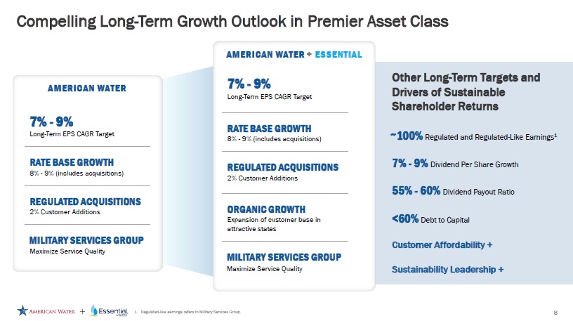 Best - in - Class Water Quality Provider • Cements nationwide leadership in water quality best practices, including PFAS and lead remediation, for the benefit of customers • Scale advantage to address large - scale surface water quality challenges • Delivering innovative, targeted solutions to address groundwater quality challenges • Leveraging best practices across industry - leading water quality R&D labs and talent to drive sustainable service enhancements for customers Combining Two Complementary Platforms to Expand Market Reach and Unlock Efficiencies, Best Practices Together, the businesses will continue to set the best - in - class standards for water quality, customer experience, and infrastructure replacement and renewal Premier Partner - of - Choice Water Utility for Municipal Providers • Solidifies position as a compelling option for communities when considering a sale • Exciting new geographies with clear paths to organic and business development growth • Improves long - term customer growth trajectory and long - term customer affordability proposition Creating a New Top 10 Large - Cap Pure - Play Utility • Combined equity market cap of $40B 1 ranks among the top 250 in the S&P500 • Superior TSR potential driven by top - quartile EPS growth, robust dividend trajectory, long - term visible CapEx requirements, and broad regionalization opportunities in a fragmented water industry • Water and wastewater focused, fully regulated utility • Unique value proposition in terms of customer affordability and sustainability credentials Reinforce Commitment to Customers and Communities • Customer - focused company culture, with eye towards technology - driven improvements • Merges two companies that each have a legacy of volunteerism and generous support of communities, which will remain central to the combined organization • Deep industry depth in resiliency planning to uphold reliability of customer service 1. Represents combined equity market capitalization as of 10/24/2025. 7