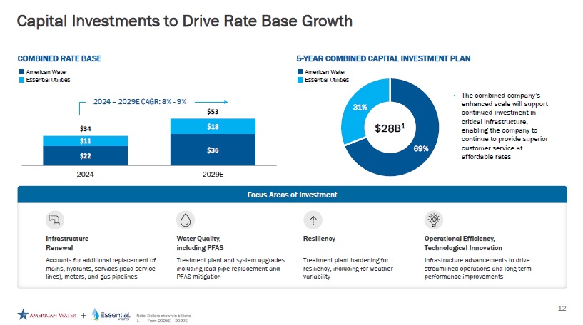 Delivers Expansive Benefits to Key Stakeholders 11 Increased career growth opportunity for employees • Strengthens position as a top employer of choice; Recognized on the Forbes America’s Best Employers for Company Culture 2025 list • Attracting top talent through reputation and expanded opportunities • Broader career advancement prospects across the organization Continuing superior customer service at affordable rates • Combined infrastructure and operational efficiencies • Maintain focus on delivering dependable water and wastewater services • Commitment to affordable customer rates with strong leverage to manage supply chain costs for customers’ benefit Value creation for shareholders • Enhanced stake in a larger regulated utility platform • Access to broader geographic and regulatory exposure • Participation in long - term value creation Support communities through unified services • Sustained investment in philanthropic initiatives • Expanded presence in overlapping and new service territories • Coordinated services for local employees to efficiently meet local needs