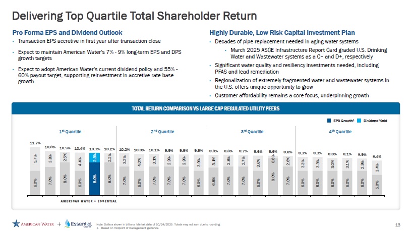 $22 $36 $11 $18 $34 $53 2024 2029E Focus Areas of Investment Note: Dollars shown in billions. 1. From 2025E – 2029E. American Water Essential Utilities American Water Essential Utilities Capital Investments to Drive Rate Base Growth Operational Efficiency, Technological Innovation Resiliency Water Quality, including PFAS Infrastructure Renewal Infrastructure advancements to drive streamlined operations and long - term performance improvements Treatment plant hardening for resiliency, including for weather variability Treatment plant and system upgrades including lead pipe replacement and PFAS mitigation Accounts for additional replacement of mains, hydrants, services (lead service lines), meters, and gas pipelines 12 2024 – 2029E CAGR: 8% - 9% 69% 31% $28B 1 • The combined company’s enhanced scale will support continued investment in critical infrastructure, enabling the company to continue to provide superior customer service at affordable rates 5 - YEAR COMBINED CAPITAL INVESTMENT PLAN COMBINED RATE BASE