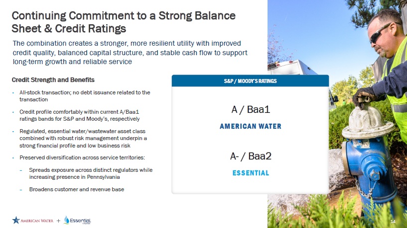 TOTAL RETURN COMPARISON VS LARGE CAP REGULATED UTILITY PEERS Note: Dollars shown in billions. Market data of 10/24/2025. Totals may not sum due to rounding. 1. Based on midpoint of management guidance. Delivering Top Quartile Total Shareholder Return 13 EPS Growth 1 Dividend Yield A ME R I C A N W ATE R + E S S E N T I A L Pro Forma EPS and Dividend Outlook • Transaction EPS accretive in first year after transaction close • Expect to maintain American Water’s 7% - 9% long - term EPS and DPS growth targets • Expect to adopt American Water’s current dividend policy and 55% - 60% payout target, supporting reinvestment in accretive rate base growth • Decades of pipe replacement needed in aging water systems • March 2025 ASCE Infrastructure Report Card graded U.S. Drinking Water and Wastewater systems as a C – and D+, respectively • Significant water quality and resiliency investments needed, including PFAS and lead remediation • Regionalization of extremely fragmented water and wastewater systems in the U.S. offers unique opportunity to grow • Customer affordability remains a core focus, underpinning growth Highly Durable, Low Risk Capital Investment Plan 4 th Quartile 1 st Quartile 2 nd Quartile 3 rd Quartile 6.0% 7.0% 8.0% 6.0% 8.0% 8.0% 7.0% 6.0% 7.0% 7.0% 7.0% 6.0% 6.8% 7.0% 7.0% 6.0% 9.0% 7.0% 6.0% 6.0% 6.0% 6.0% 6.0% 5.0% 5.7% 3.8% 2.5% 4.4% 2.3% 2.2% 3.2% 4.0% 3.1% 2.9% 2.9% 3.9% 3.1% 2.8% 2.7% 3.6% 0.6% 2.6% 3.3% 3.3% 3.0% 3.1% 2.9% 3.4% 11.7% 10.8% 10.5% 10.4% 10.3% 10.2% 10.2% 10.0% 10.1% 9.9% 9.9% 9.9% 9.8% 9.8% 9.7% 9.6% 9.6% 9.6% 9.3% 9.3% 9.0% 9.1% 8.9% 8.4%