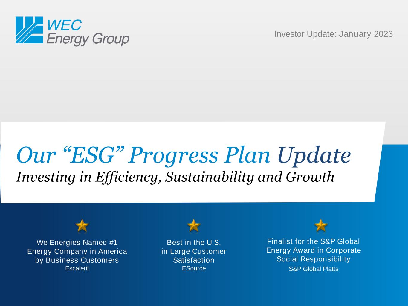 Investor Update: January 2023 Our “ESG” Progress Plan Update Investing in Efficiency, Sustainability and Growth Best in the U.S. in Large Customer Satisfaction ESource We Energies Named #1 Energy Company in America by Business Customers Escalent Finalist for the S&P Global Energy Award in Corporate Social Responsibility S&P Global Platts