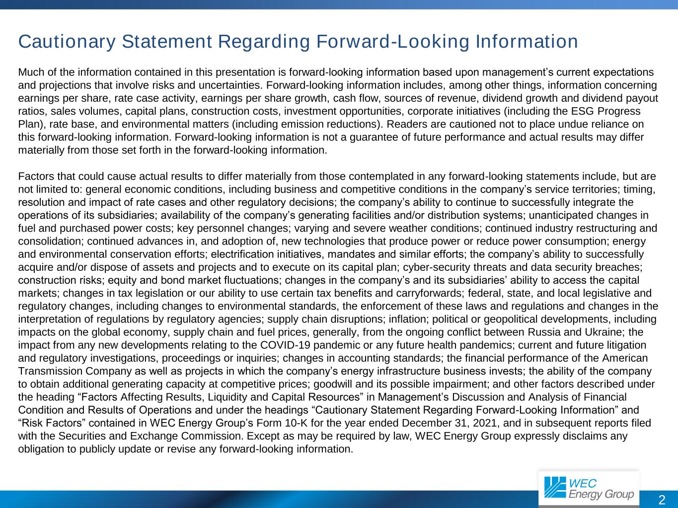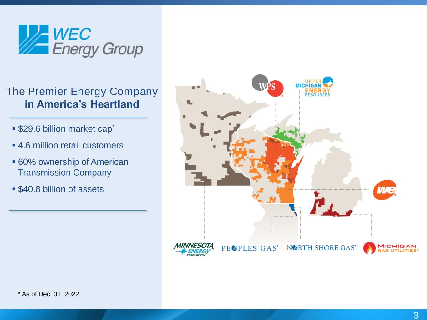 2 Cautionary Statement Regarding Forward-Looking Information Much of the information contained in this presentation is forward-looking information based upon management’s current expectations and projections that involve risks and uncertainties. Forward-looking information includes, among other things, information concerning earnings per share, rate case activity, earnings per share growth, cash flow, sources of revenue, dividend growth and dividend payout ratios, sales volumes, capital plans, construction costs, investment opportunities, corporate initiatives (including the ESG Progress Plan), rate base, and environmental matters (including emission reductions). Readers are cautioned not to place undue reliance on this forward-looking information. Forward-looking information is not a guarantee of future performance and actual results may differ materially from those set forth in the forward-looking information. Factors that could cause actual results to differ materially from those contemplated in any forward-looking statements include, but are not limited to: general economic conditions, including business and competitive conditions in the company’s service territories; timing, resolution and impact of rate cases and other regulatory decisions; the company’s ability to continue to successfully integrate the operations of its subsidiaries; availability of the company’s generating facilities and/or distribution systems; unanticipated changes in fuel and purchased power costs; key personnel changes; varying and severe weather conditions; continued industry restructuring and consolidation; continued advances in, and adoption of, new technologies that produce power or reduce power consumption; energy and environmental conservation efforts; electrification initiatives, mandates and similar efforts; the company’s ability to successfully acquire and/or dispose of assets and projects and to execute on its capital plan; cyber-security threats and data security breaches; construction risks; equity and bond market fluctuations; changes in the company’s and its subsidiaries’ ability to access the capital markets; changes in tax legislation or our ability to use certain tax benefits and carryforwards; federal, state, and local legislative and regulatory changes, including changes to environmental standards, the enforcement of these laws and regulations and changes in the interpretation of regulations by regulatory agencies; supply chain disruptions; inflation; political or geopolitical developments, including impacts on the global economy, supply chain and fuel prices, generally, from the ongoing conflict between Russia and Ukraine; the impact from any new developments relating to the COVID-19 pandemic or any future health pandemics; current and future litigation and regulatory investigations, proceedings or inquiries; changes in accounting standards; the financial performance of the American Transmission Company as well as projects in which the company’s energy infrastructure business invests; the ability of the company to obtain additional generating capacity at competitive prices; goodwill and its possible impairment; and other factors described under the heading “Factors Affecting Results, Liquidity and Capital Resources” in Management’s Discussion and Analysis of Financial Condition and Results of Operations and under the headings “Cautionary Statement Regarding Forward-Looking Information” and “Risk Factors” contained in WEC Energy Group’s Form 10-K for the year ended December 31, 2021, and in subsequent reports filed with the Securities and Exchange Commission. Except as may be required by law, WEC Energy Group expressly disclaims any obligation to publicly update or revise any forward-looking information.