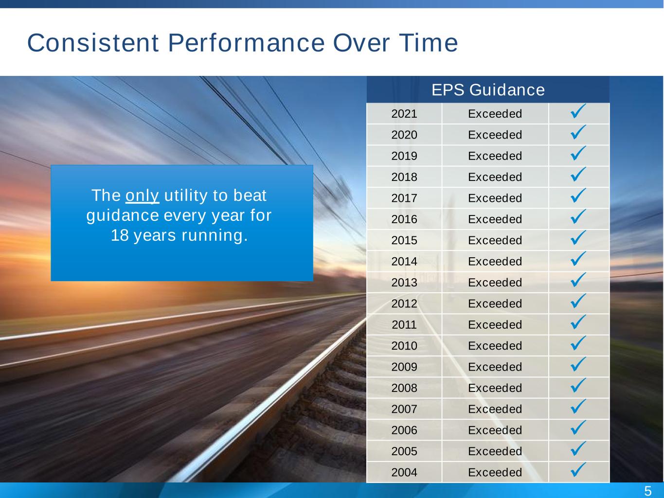4 A History of Quality Earnings Growth $0.00 $0.50 $1.00 $1.50 $2.00 $2.50 $3.00 $3.50 $4.00 $4.50 $5.00 '04 '05 '06 '07 '08 '09 '10 '11 '12 '13 '14 '15 '16 '17 '18 '19 '20 '21 '22 '23 GAAP Adjusted** 2022 Guidance 2023 Guidance * Estimated based on 2023 guidance midpoint of $4.60 per share. ** See Appendix for reconciliation of adjusted amounts to GAAP amounts. $4.58-$4.62