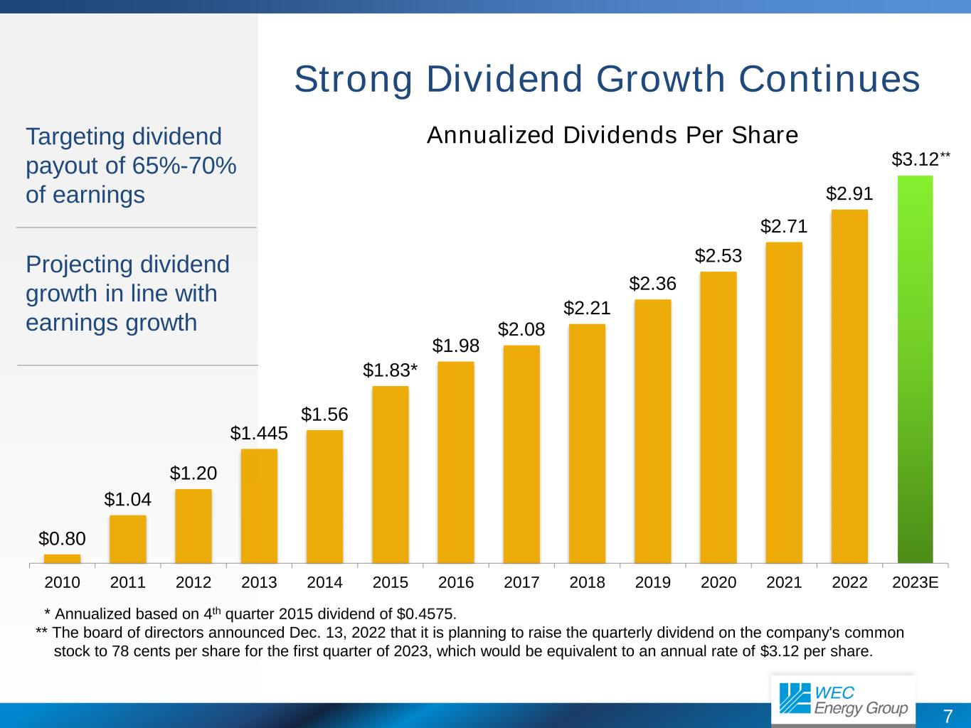 6 The board of directors announced its plan to raise the dividend by 7.2% to a new annual rate of $3.12 per share* Strong Dividend Growth Continues Top decile dividend growth in industry** ** Reflects dividends declared in 2022 *The board of directors announced Dec. 13, 2022 that it is planning to raise the quarterly dividend on the company's common stock to 78 cents per share for the first quarter of 2023, which would be equivalent to an annual rate of $3.12 per share.