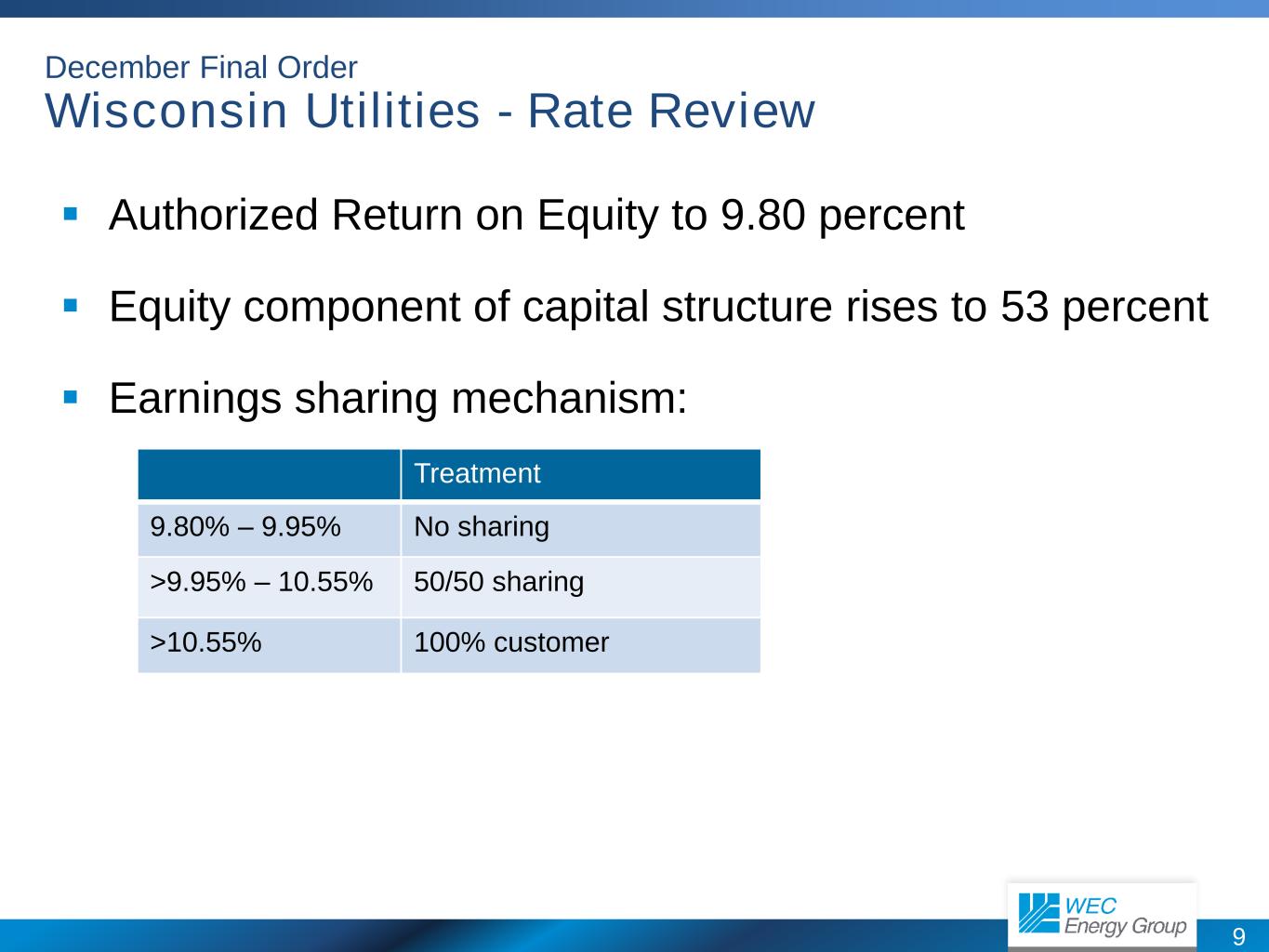 9  Authorized Return on Equity to 9.80 percent  Equity component of capital structure rises to 53 percent  Earnings sharing mechanism: December Final Order Wisconsin Utilities - Rate Review Treatment 9.80% – 9.95% No sharing >9.95% – 10.55% 50/50 sharing >10.55% 100% customer
