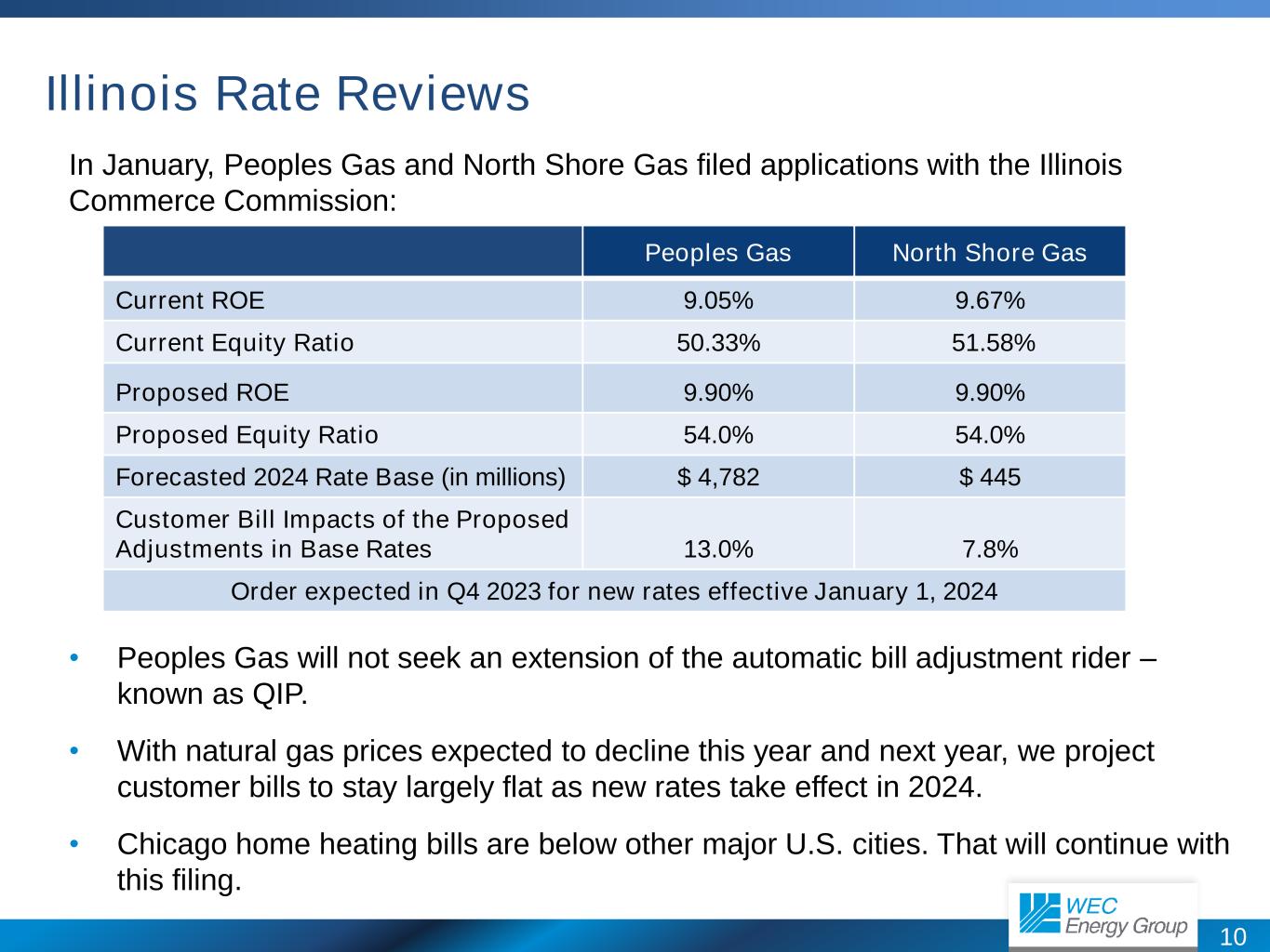 45 Estimated Decision Date Wisconsin (apps.psc.wi.gov)  Commission decision on general rate review for new base rates effective 1/1/2023 (Dockets: WE and WG: 5-UR-110 and WPS 6690-UR-127)   Decision on Whitewater Acquisition (Docket: 5-BS-264 filed 12/21/2021)   Decision on Darien Solar and Battery Storage (Docket: 5-BS-255 filed 3/16/2021)   Decision on West Riverside 100 MW Acquisition (Docket: 5-BS-265 filed 1/31/2022) Q1 2023  Decision on Koshkonong Solar and Battery Storage (Docket: 5-BS-258 filed 4/30/2021) Q1 2023 Illinois (icc.illinois.gov)  Decision on general rate review for new base rates effective 1/1/2024 (Dockets PGL: XX-XXXX and NSG XX-XXXXX filed 1/6/23) Q4 2023  Decision on 2016 Rider QIP Reconciliation (Docket: 17-0137 filed 3/20/17) 2023 Michigan (michigan.gov/mpsc) Minnesota (mn.gov/puc)  Interim rate increase of $37.0 million or 9.1% effective 1/1/2023   Decision on proposed base rate increase of $40.3 million or 9.9% (Docket G011/GR-22-504 filed 11/1/2022) 2023 Regulatory Matters