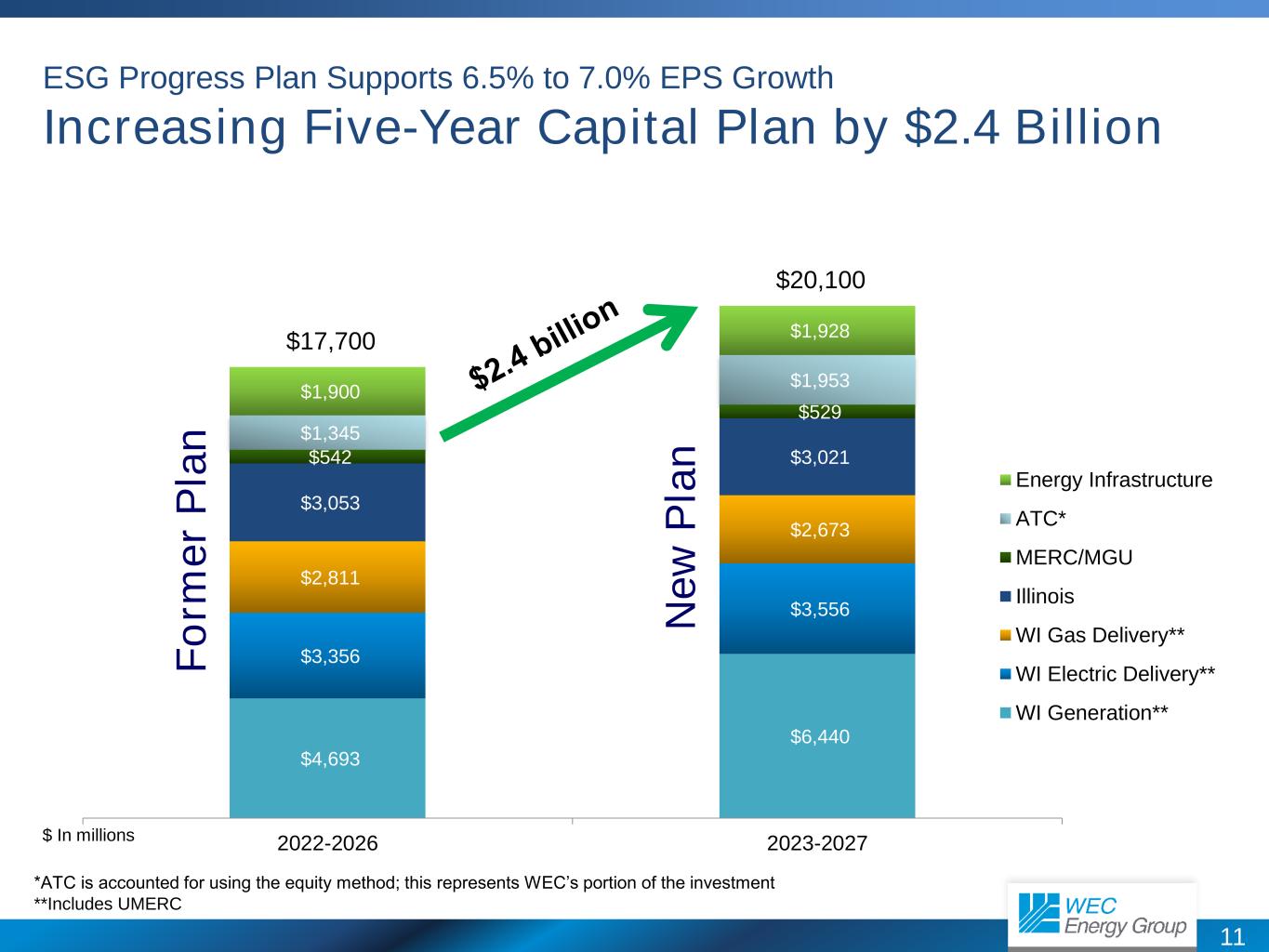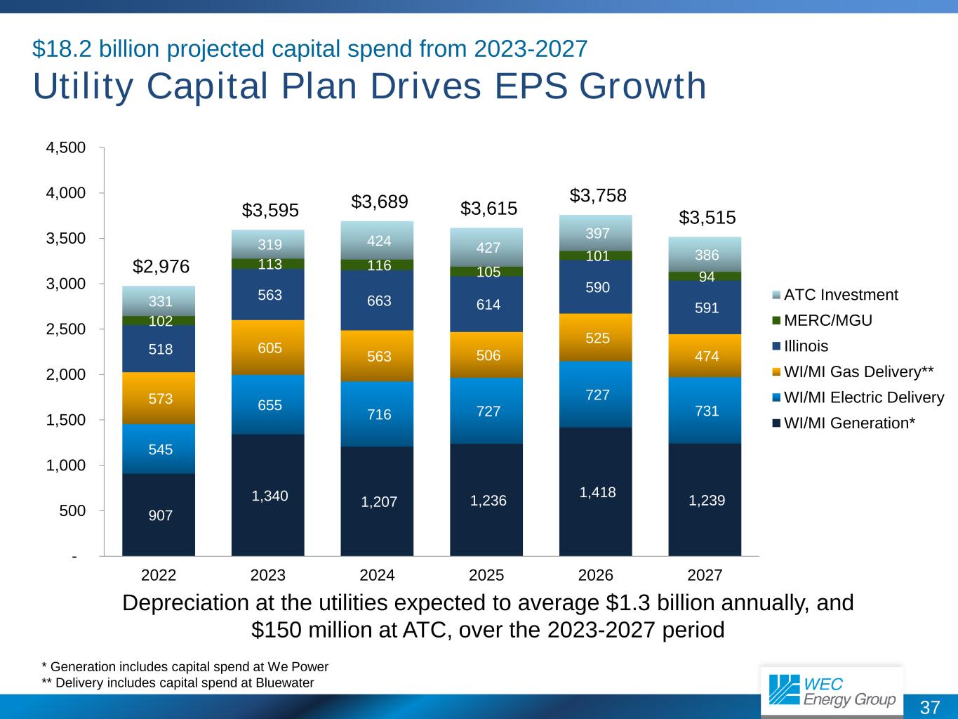 37 907 1,340 1,207 1,236 1,418 1,239 545 655 716 727 727 731 573 605 563 506 525 474 518 563 663 614 590 591 102 113 116 105 101 94 331 319 424 427 397 386 $2,976 $3,595 $3,689 $3,615 $3,758 $3,515 - 500 1,000 1,500 2,000 2,500 3,000 3,500 4,000 4,500 2022 2023 2024 2025 2026 2027 ATC Investment MERC/MGU Illinois WI/MI Gas Delivery** WI/MI Electric Delivery WI/MI Generation* Depreciation at the utilities expected to average $1.3 billion annually, and $150 million at ATC, over the 2023-2027 period * Generation includes capital spend at We Power ** Delivery includes capital spend at Bluewater $18.2 billion projected capital spend from 2023-2027 Utility Capital Plan Drives EPS Growth