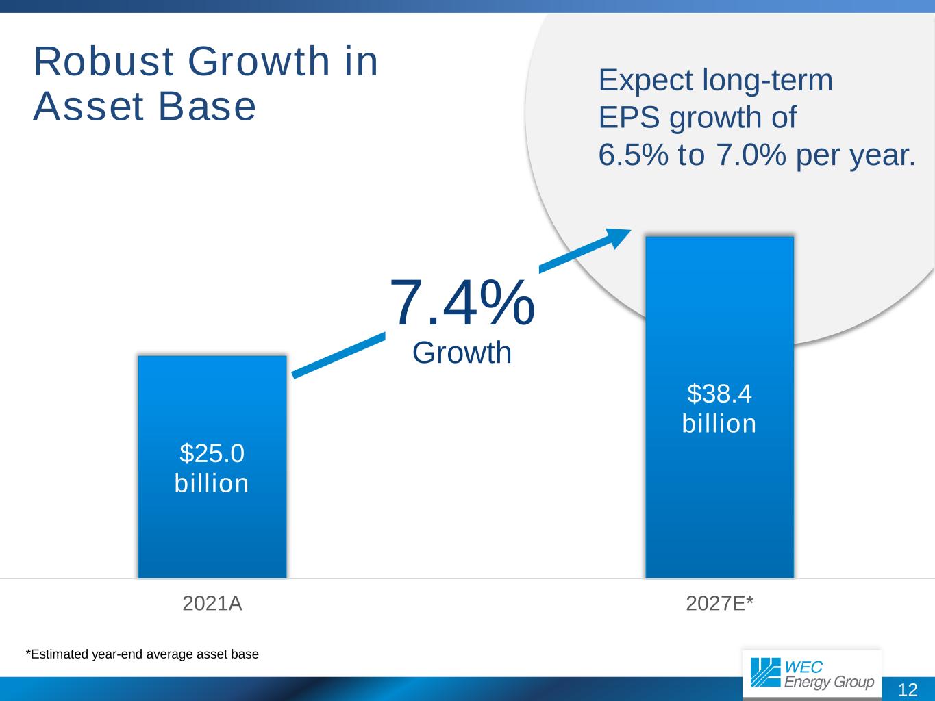 11 $4,693 $6,440 $3,356 $3,556 $2,811 $2,673 $3,053 $3,021 $542 $529 $1,345 $1,953 $1,900 $1,928 $17,700 $20,100 2022-2026 2023-2027 Energy Infrastructure ATC* MERC/MGU Illinois WI Gas Delivery** WI Electric Delivery** WI Generation** N e w P la n F o rm e r P la n ESG Progress Plan Supports 6.5% to 7.0% EPS Growth Increasing Five-Year Capital Plan by $2.4 Billion *ATC is accounted for using the equity method; this represents WEC’s portion of the investment **Includes UMERC $ In millions