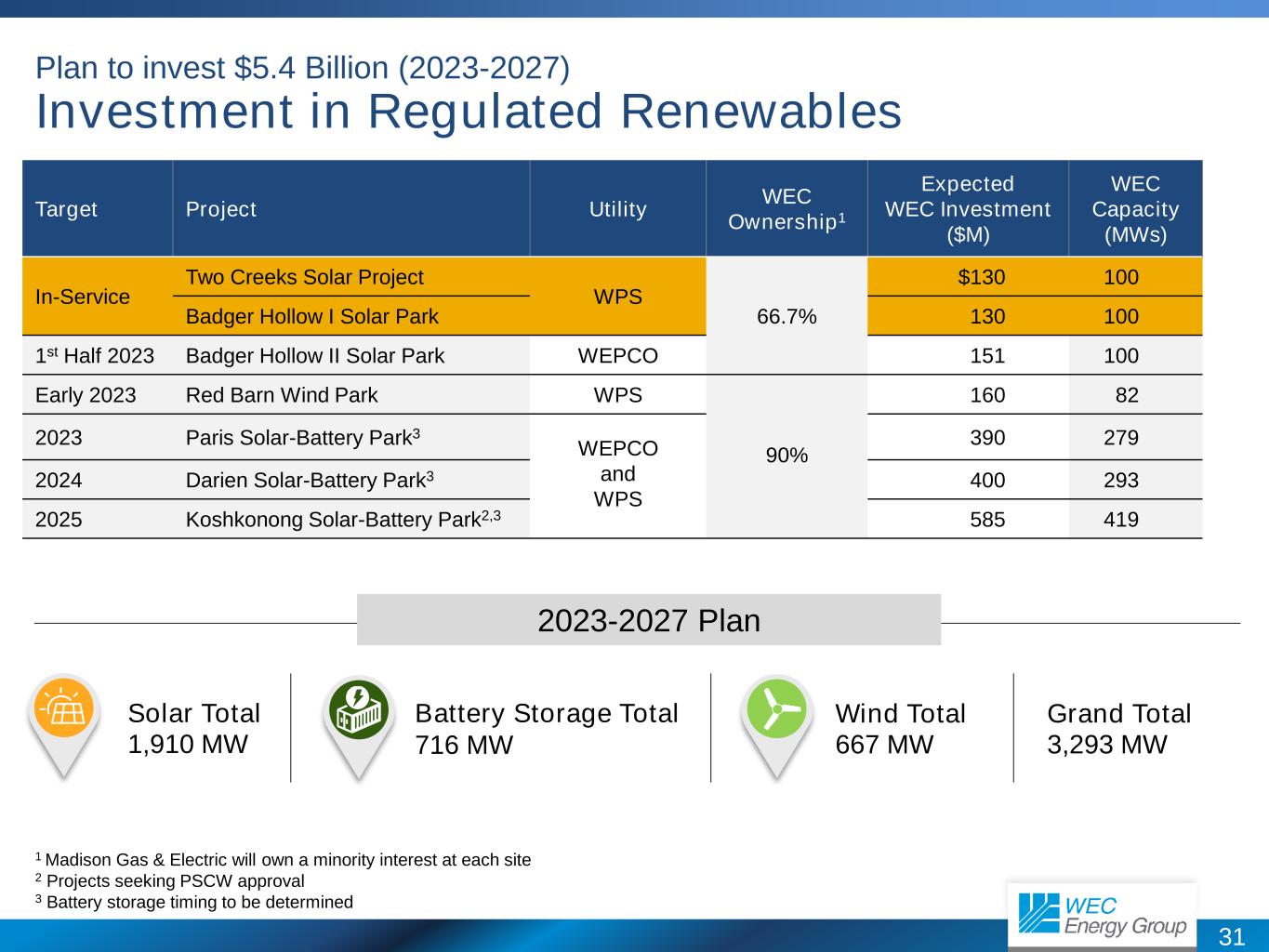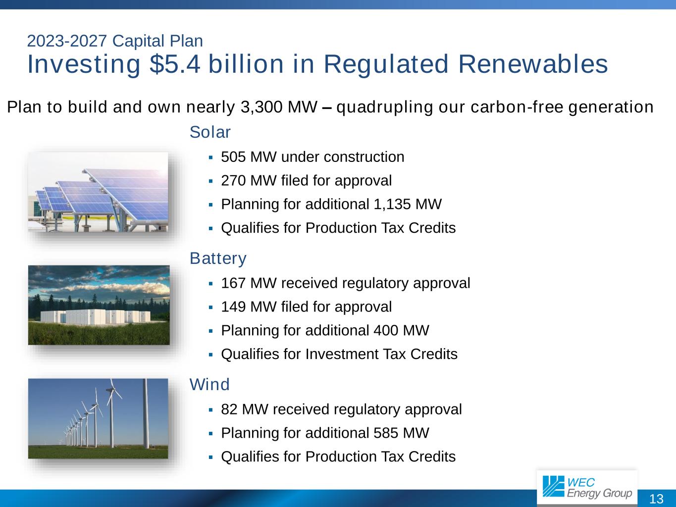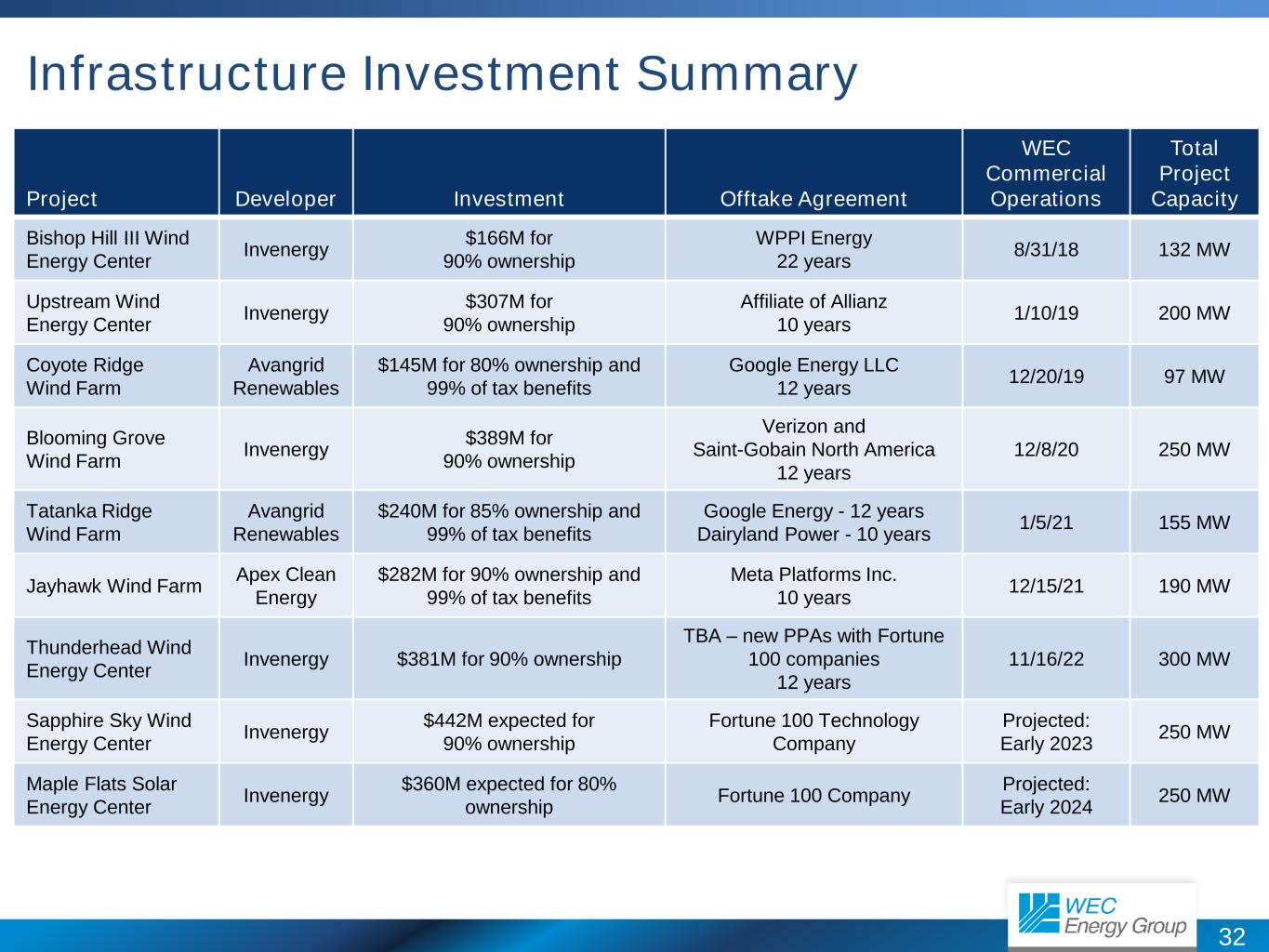 32 Project Developer Investment Offtake Agreement WEC Commercial Operations Total Project Capacity Bishop Hill III Wind Energy Center Invenergy $166M for 90% ownership WPPI Energy 22 years 8/31/18 132 MW Upstream Wind Energy Center Invenergy $307M for 90% ownership Affiliate of Allianz 10 years 1/10/19 200 MW Coyote Ridge Wind Farm Avangrid Renewables $145M for 80% ownership and 99% of tax benefits Google Energy LLC 12 years 12/20/19 97 MW Blooming Grove Wind Farm Invenergy $389M for 90% ownership Verizon and Saint-Gobain North America 12 years 12/8/20 250 MW Tatanka Ridge Wind Farm Avangrid Renewables $240M for 85% ownership and 99% of tax benefits Google Energy - 12 years Dairyland Power - 10 years 1/5/21 155 MW Jayhawk Wind Farm Apex Clean Energy $282M for 90% ownership and 99% of tax benefits Meta Platforms Inc. 10 years 12/15/21 190 MW Thunderhead Wind Energy Center Invenergy $381M for 90% ownership TBA – new PPAs with Fortune 100 companies 12 years 11/16/22 300 MW Sapphire Sky Wind Energy Center Invenergy $442M expected for 90% ownership Fortune 100 Technology Company Projected: Early 2023 250 MW Maple Flats Solar Energy Center Invenergy $360M expected for 80% ownership Fortune 100 Company Projected: Early 2024 250 MW Infrastructure Investment Summary