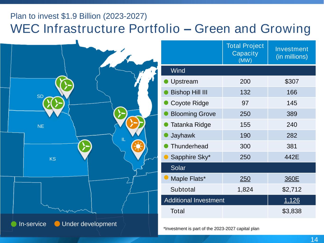 13 Solar  505 MW under construction  270 MW filed for approval  Planning for additional 1,135 MW  Qualifies for Production Tax Credits Battery  167 MW received regulatory approval  149 MW filed for approval  Planning for additional 400 MW  Qualifies for Investment Tax Credits Wind  82 MW received regulatory approval  Planning for additional 585 MW  Qualifies for Production Tax Credits 2023-2027 Capital Plan Investing $5.4 billion in Regulated Renewables Plan to build and own nearly 3,300 MW – quadrupling our carbon-free generation