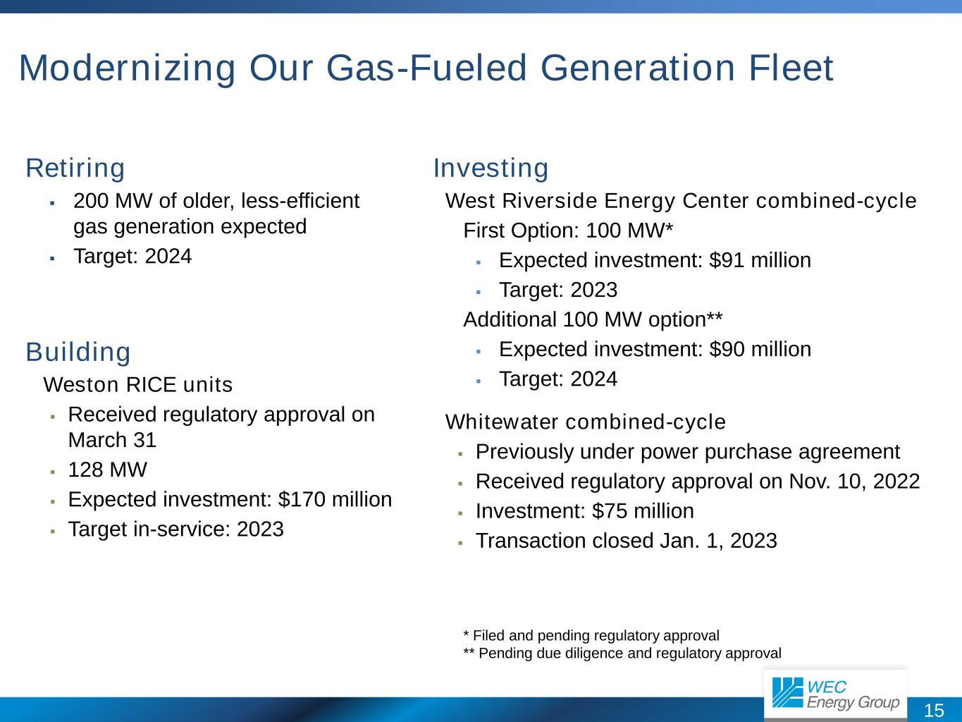 14 SD IL NE Plan to invest $1.9 Billion (2023-2027) WEC Infrastructure Portfolio – Green and Growing In-service Under development Total Project Capacity (MW) Investment (in millions) Wind Upstream 200 $307 Bishop Hill III 132 166 Coyote Ridge 97 145 Blooming Grove 250 389 Tatanka Ridge 155 240 Jayhawk 190 282 Thunderhead 300 381 Sapphire Sky* 250 442E Solar Maple Flats* 250 360E Subtotal 1,824 $2,712 Additional Investment 1,126 Total $3,838 *Investment is part of the 2023-2027 capital plan KS