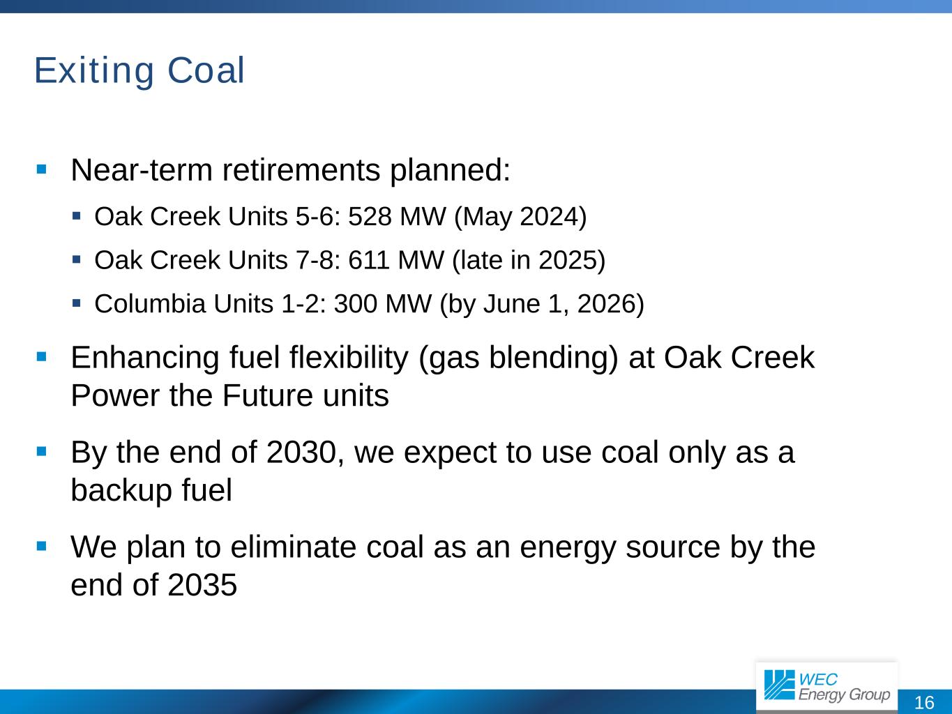 15 Modernizing Our Gas-Fueled Generation Fleet Retiring  200 MW of older, less-efficient gas generation expected  Target: 2024 Building Weston RICE units  Received regulatory approval on March 31  128 MW  Expected investment: $170 million  Target in-service: 2023 * Filed and pending regulatory approval ** Pending due diligence and regulatory approval Investing West Riverside Energy Center combined-cycle First Option: 100 MW*  Expected investment: $91 million  Target: 2023 Additional 100 MW option**  Expected investment: $90 million  Target: 2024 Whitewater combined-cycle  Previously under power purchase agreement  Received regulatory approval on Nov. 10, 2022  Investment: $75 million  Transaction closed Jan. 1, 2023