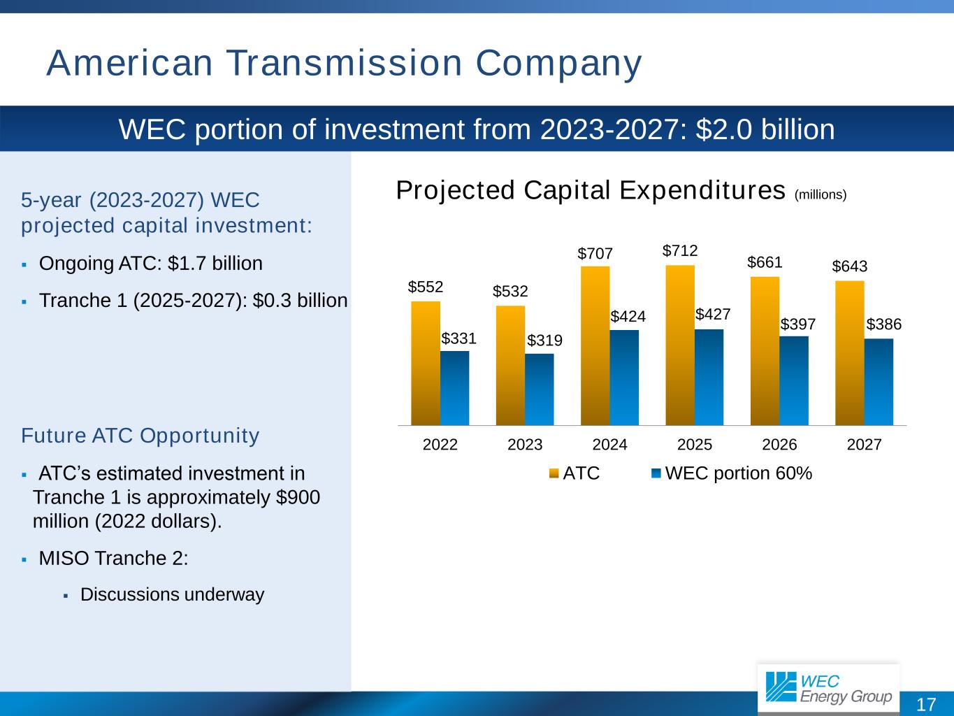 17 $552 $532 $707 $712 $661 $643 $331 $319 $424 $427 $397 $386 2022 2023 2024 2025 2026 2027 ATC WEC portion 60% American Transmission Company 5-year (2023-2027) WEC projected capital investment:  Ongoing ATC: $1.7 billion  Tranche 1 (2025-2027): $0.3 billion Future ATC Opportunity  ATC’s estimated investment in Tranche 1 is approximately $900 million (2022 dollars).  MISO Tranche 2:  Discussions underway Projected Capital Expenditures (millions) WEC portion of investment from 2023-2027: $2.0 billion