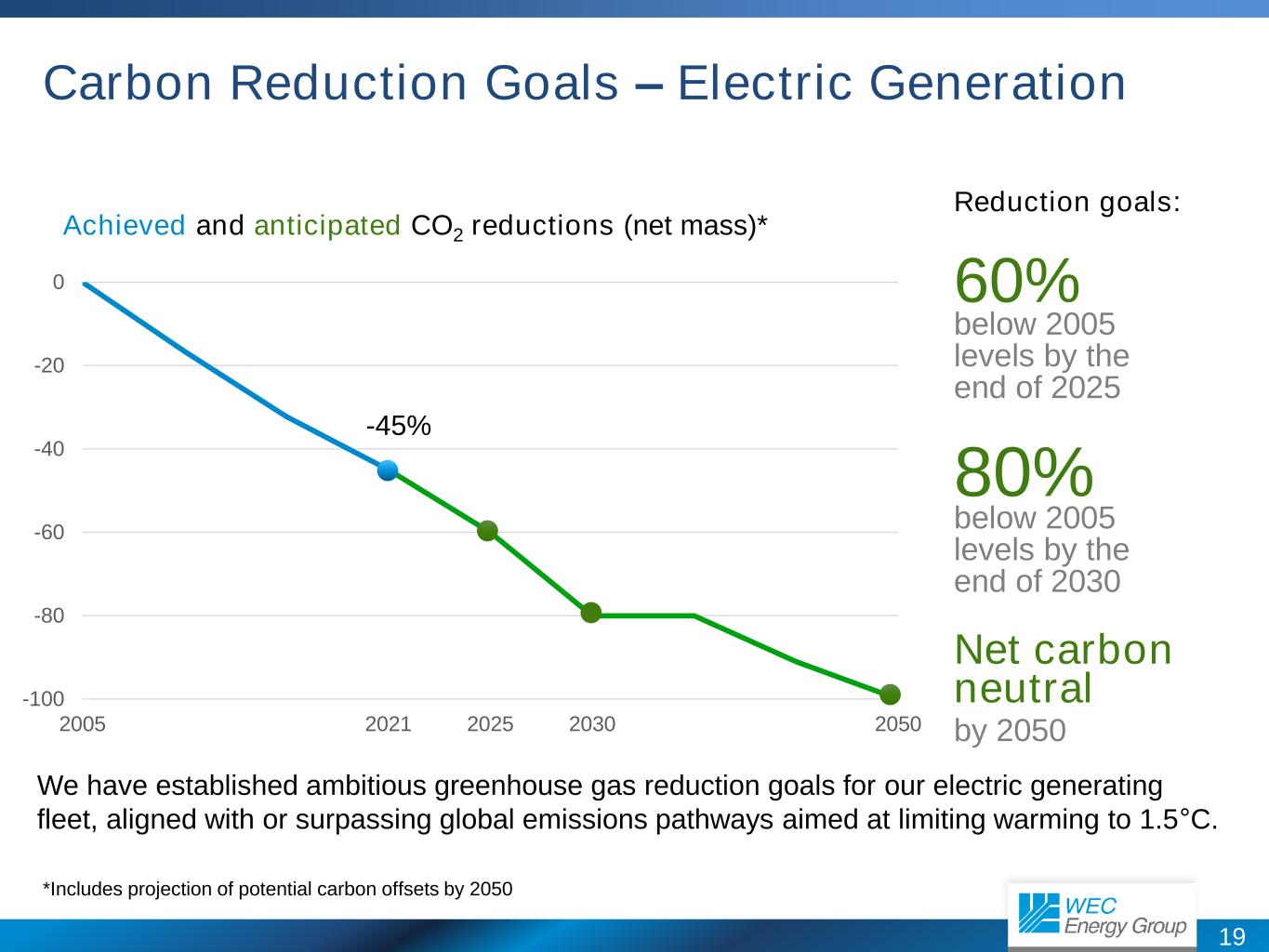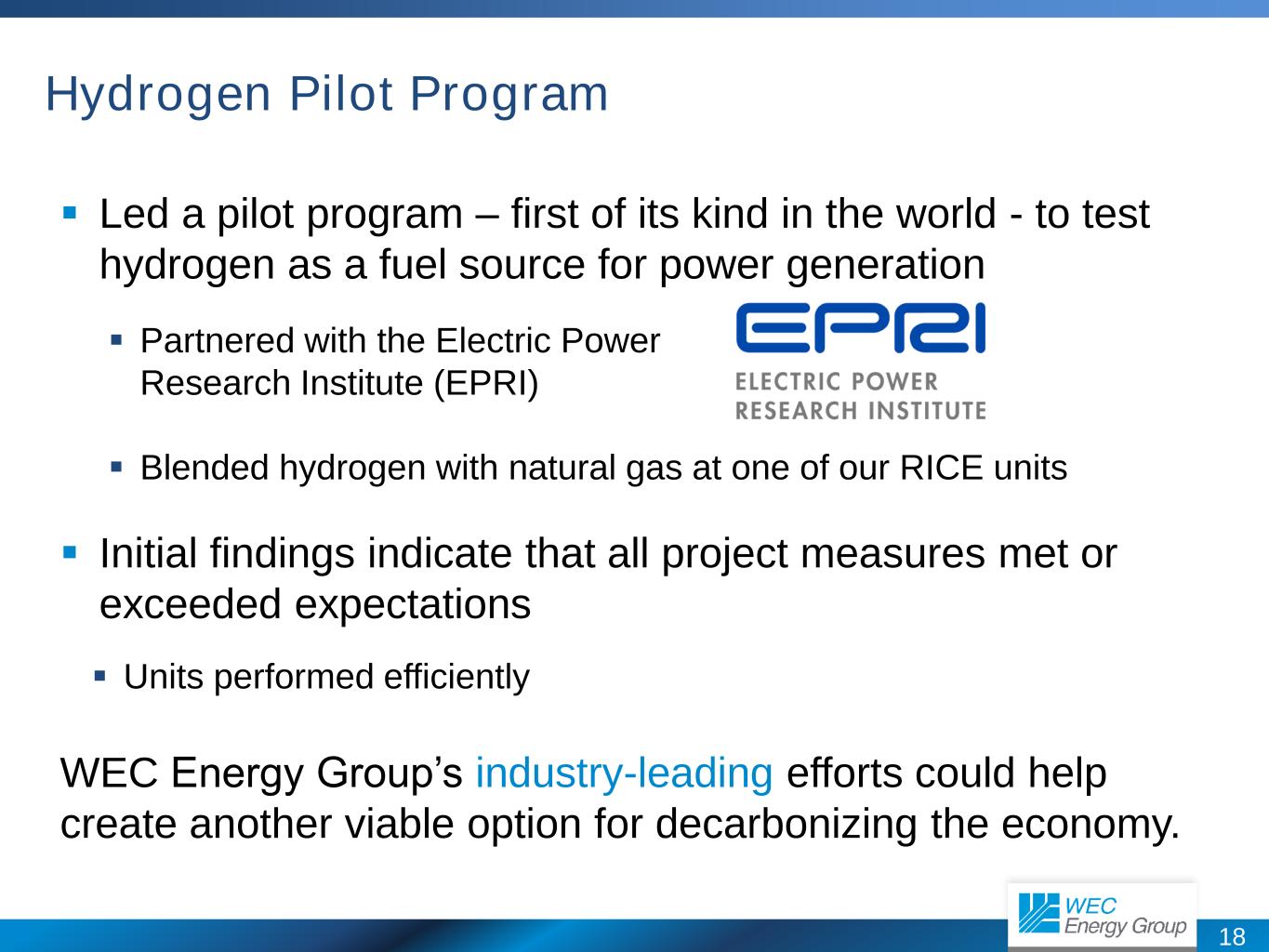 18  Led a pilot program – first of its kind in the world - to test hydrogen as a fuel source for power generation  Partnered with the Electric Power Research Institute (EPRI)  Blended hydrogen with natural gas at one of our RICE units  Initial findings indicate that all project measures met or exceeded expectations  Units performed efficiently WEC Energy Group’s industry-leading efforts could help create another viable option for decarbonizing the economy. Hydrogen Pilot Program