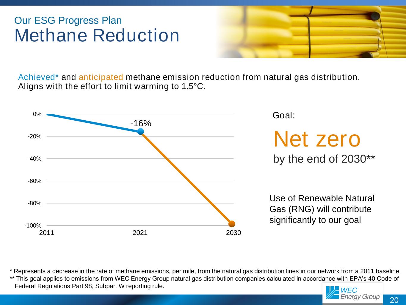20 Goal: Net zero by the end of 2030** * Represents a decrease in the rate of methane emissions, per mile, from the natural gas distribution lines in our network from a 2011 baseline. ** This goal applies to emissions from WEC Energy Group natural gas distribution companies calculated in accordance with EPA’s 40 Code of Federal Regulations Part 98, Subpart W reporting rule. -100% -80% -60% -40% -20% 0% 2011 2021 2030 Achieved* and anticipated methane emission reduction from natural gas distribution. Aligns with the effort to limit warming to 1.5°C. -16% Use of Renewable Natural Gas (RNG) will contribute significantly to our goal Our ESG Progress Plan Methane Reduction