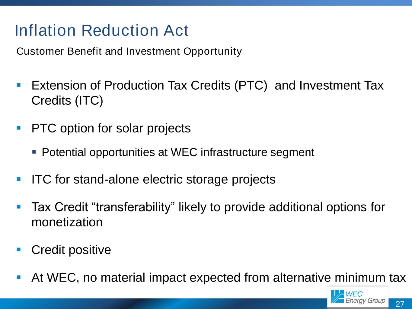 27  Extension of Production Tax Credits (PTC) and Investment Tax Credits (ITC)  PTC option for solar projects  Potential opportunities at WEC infrastructure segment  ITC for stand-alone electric storage projects  Tax Credit “transferability” likely to provide additional options for monetization  Credit positive  At WEC, no material impact expected from alternative minimum tax Inflation Reduction Act Customer Benefit and Investment Opportunity