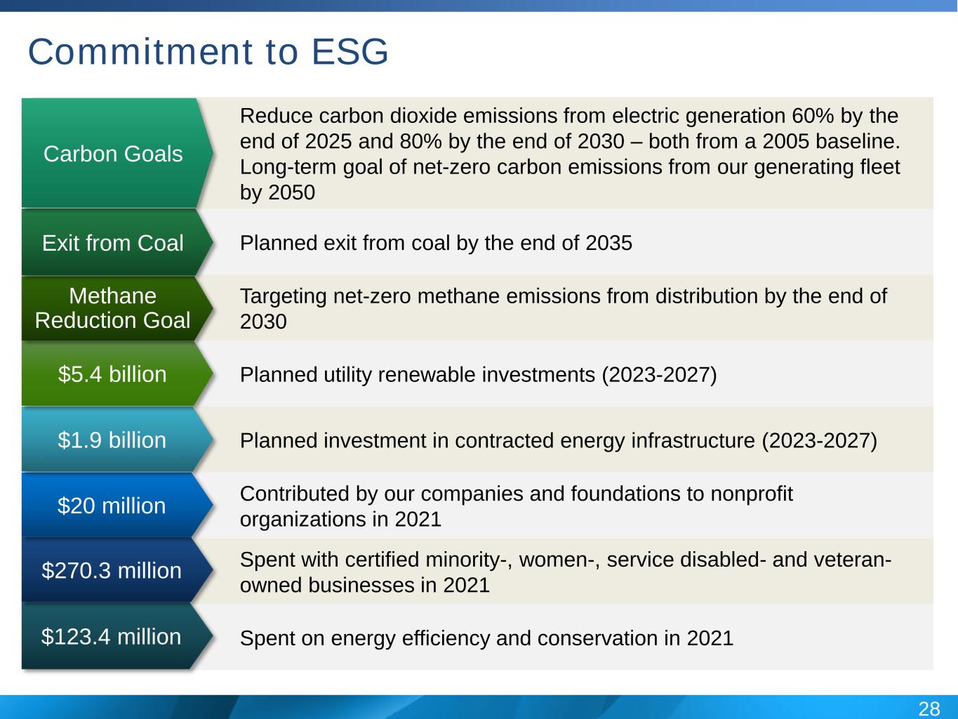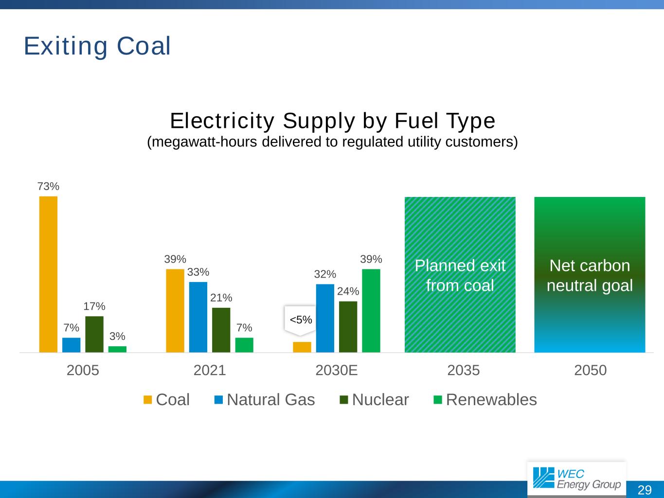 28 Reduce carbon dioxide emissions from electric generation 60% by the end of 2025 and 80% by the end of 2030 – both from a 2005 baseline. Long-term goal of net-zero carbon emissions from our generating fleet by 2050 Planned exit from coal by the end of 2035 Targeting net-zero methane emissions from distribution by the end of 2030 Planned utility renewable investments (2023-2027) ) Planned investment in contracted energy infrastructure (2023-2027) Contributed by our companies and foundations to nonprofit organizations in 2021 Spent with certified minority-, women-, service disabled- and veteran- owned businesses in 2021 Spent on energy efficiency and conservation in 2021 Commitment to ESG $123.4 million $270.3 million $20 million $1.9 billion $5.4 billion Methane Reduction Goal Exit from Coal Carbon Goals