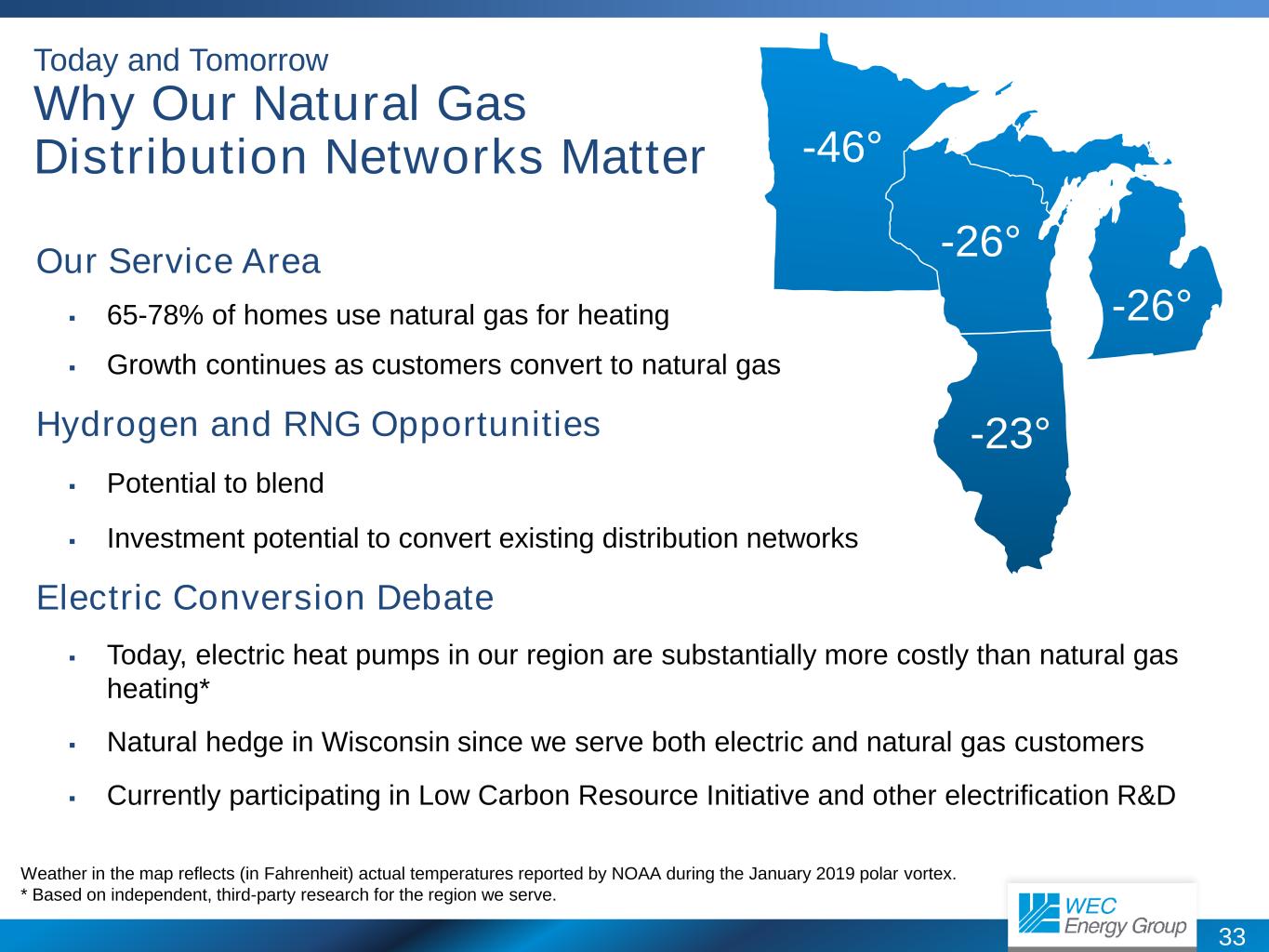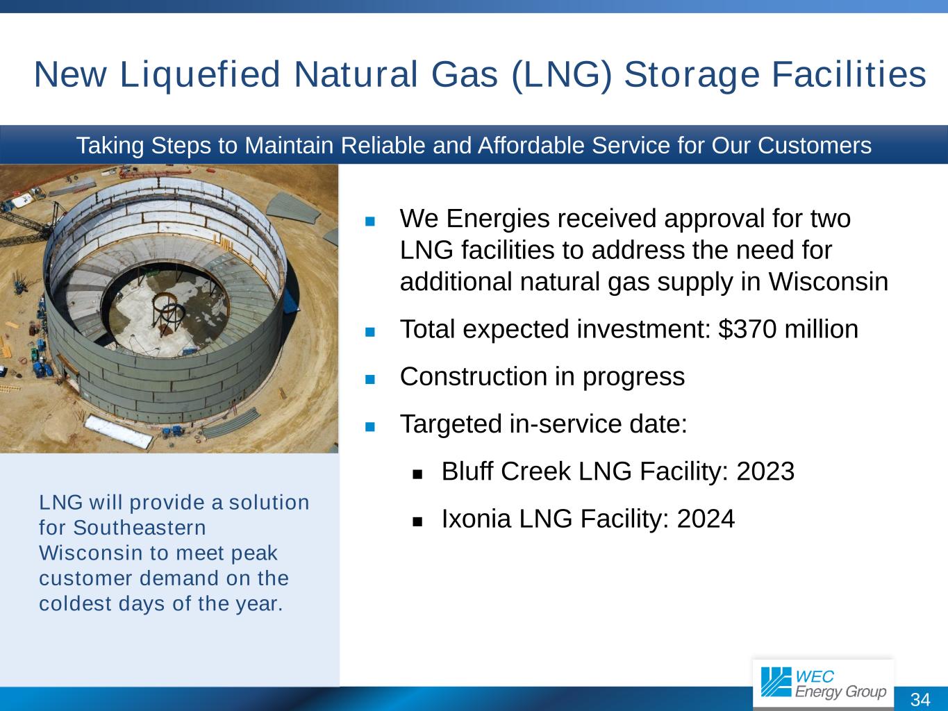33 Today and Tomorrow Why Our Natural Gas Distribution Networks Matter Our Service Area  65-78% of homes use natural gas for heating  Growth continues as customers convert to natural gas Hydrogen and RNG Opportunities  Potential to blend  Investment potential to convert existing distribution networks Electric Conversion Debate  Today, electric heat pumps in our region are substantially more costly than natural gas heating*  Natural hedge in Wisconsin since we serve both electric and natural gas customers  Currently participating in Low Carbon Resource Initiative and other electrification R&D -46° -26° -26° -23° Weather in the map reflects (in Fahrenheit) actual temperatures reported by NOAA during the January 2019 polar vortex. * Based on independent, third-party research for the region we serve.
