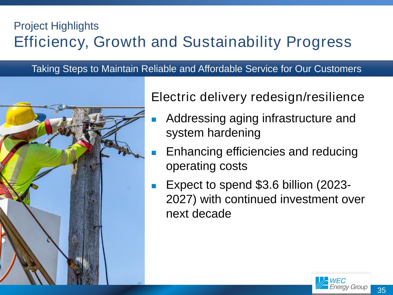 34 New Liquefied Natural Gas (LNG) Storage Facilities LNG will provide a solution for Southeastern Wisconsin to meet peak customer demand on the coldest days of the year.  We Energies received approval for two LNG facilities to address the need for additional natural gas supply in Wisconsin  Total expected investment: $370 million  Construction in progress  Targeted in-service date:  Bluff Creek LNG Facility: 2023  Ixonia LNG Facility: 2024 Taking Steps to Maintain Reliable and Affordable Service for Our Customers