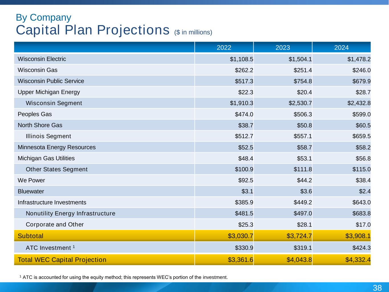 38 2022 2023 2024 Wisconsin Electric $1,108.5 $1,504.1 $1,478.2 Wisconsin Gas $262.2 $251.4 $246.0 Wisconsin Public Service $517.3 $754.8 $679.9 Upper Michigan Energy $22.3 $20.4 $28.7 Wisconsin Segment $1,910.3 $2,530.7 $2,432.8 Peoples Gas $474.0 $506.3 $599.0 North Shore Gas $38.7 $50.8 $60.5 Illinois Segment $512.7 $557.1 $659.5 Minnesota Energy Resources $52.5 $58.7 $58.2 Michigan Gas Utilities $48.4 $53.1 $56.8 Other States Segment $100.9 $111.8 $115.0 We Power $92.5 $44.2 $38.4 Bluewater $3.1 $3.6 $2.4 Infrastructure Investments $385.9 $449.2 $643.0 Nonutility Energy Infrastructure $481.5 $497.0 $683.8 Corporate and Other $25.3 $28.1 $17.0 Subtotal $3,030.7 $3,724.7 $3,908.1 ATC Investment 1 $330.9 $319.1 $424.3 Total WEC Capital Projection $3,361.6 $4,043.8 $4,332.4 By Company Capital Plan Projections ($ in millions) 1 ATC is accounted for using the equity method; this represents WEC’s portion of the investment.