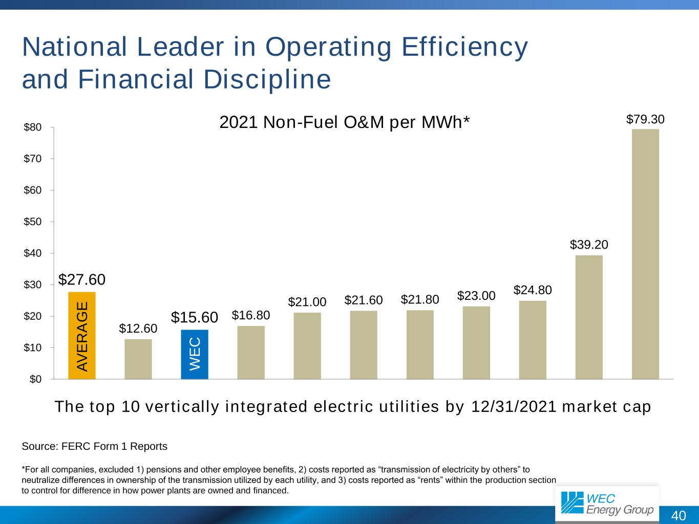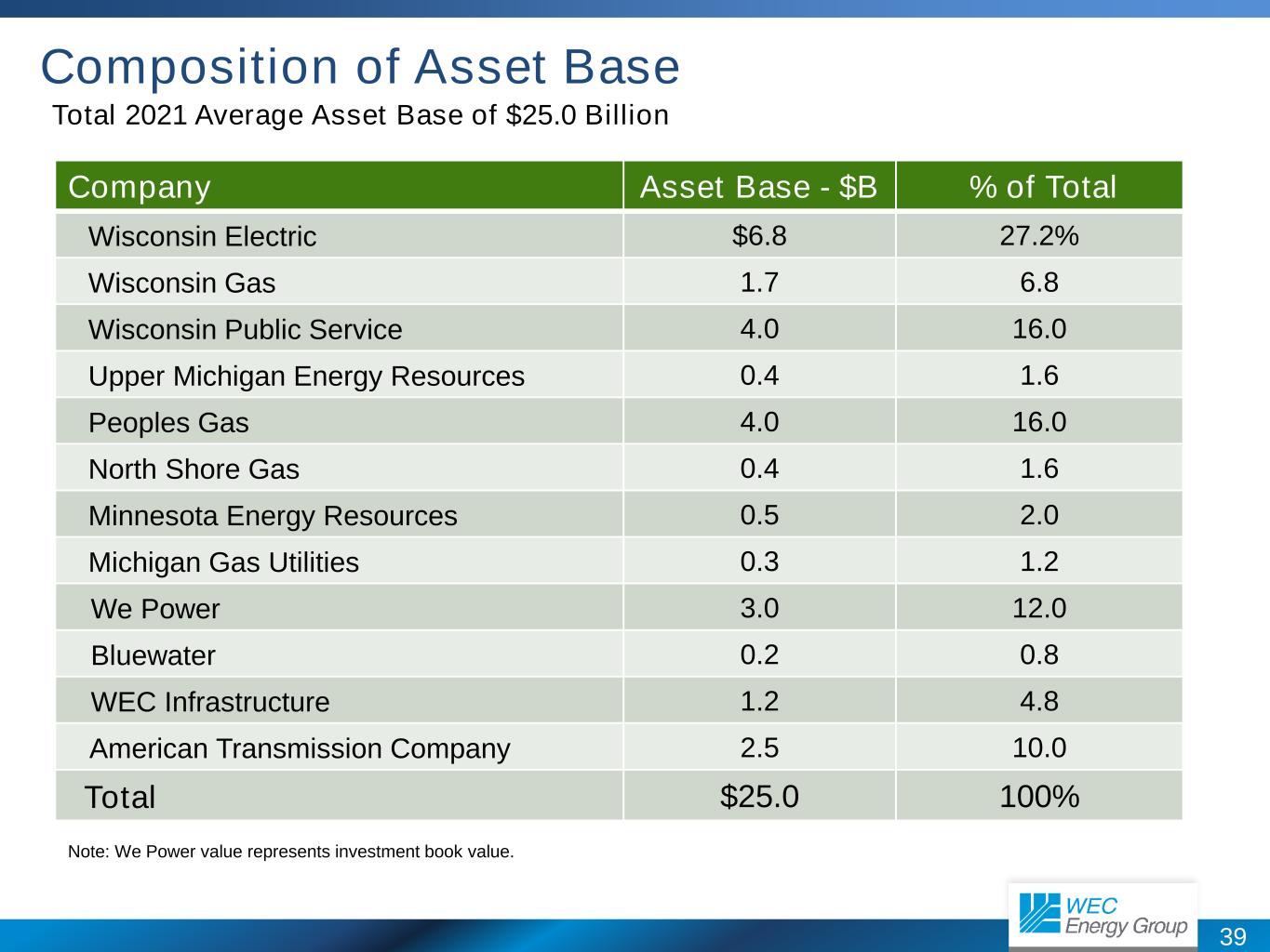 39 Composition of Asset Base Total 2021 Average Asset Base of $25.0 Billion Note: We Power value represents investment book value. Company Asset Base - $B % of Total Wisconsin Electric $6.8 27.2% Wisconsin Gas 1.7 6.8 Wisconsin Public Service 4.0 16.0 Upper Michigan Energy Resources 0.4 1.6 Peoples Gas 4.0 16.0 North Shore Gas 0.4 1.6 Minnesota Energy Resources 0.5 2.0 Michigan Gas Utilities 0.3 1.2 We Power 3.0 12.0 Bluewater 0.2 0.8 WEC Infrastructure 1.2 4.8 American Transmission Company 2.5 10.0 Total $25.0 100%