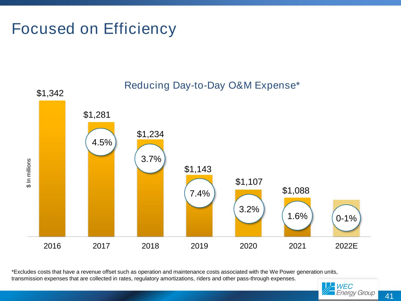 40 National Leader in Operating Efficiency and Financial Discipline $27.60 $12.60 $15.60 $16.80 $21.00 $21.60 $21.80 $23.00 $24.80 $39.20 $79.30 $0 $10 $20 $30 $40 $50 $60 $70 $80 2021 Non-Fuel O&M per MWh* Source: FERC Form 1 Reports *For all companies, excluded 1) pensions and other employee benefits, 2) costs reported as “transmission of electricity by others” to neutralize differences in ownership of the transmission utilized by each utility, and 3) costs reported as “rents” within the production section to control for difference in how power plants are owned and financed. The top 10 vertically integrated electric utilities by 12/31/2021 market cap W E C A V E R A G E