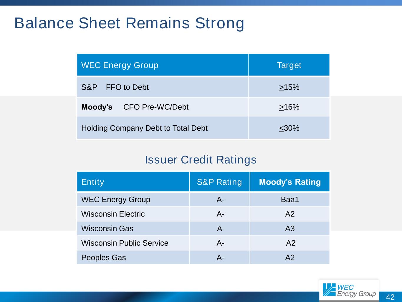 42 Balance Sheet Remains Strong Entity S&P Rating Moody’s Rating WEC Energy Group A- Baa1 Wisconsin Electric A- A2 Wisconsin Gas A A3 Wisconsin Public Service A- A2 Peoples Gas A- A2 Issuer Credit Ratings WEC Energy Group Target S&P FFO to Debt >15% Moody’s CFO Pre-WC/Debt >16% Holding Company Debt to Total Debt <30%