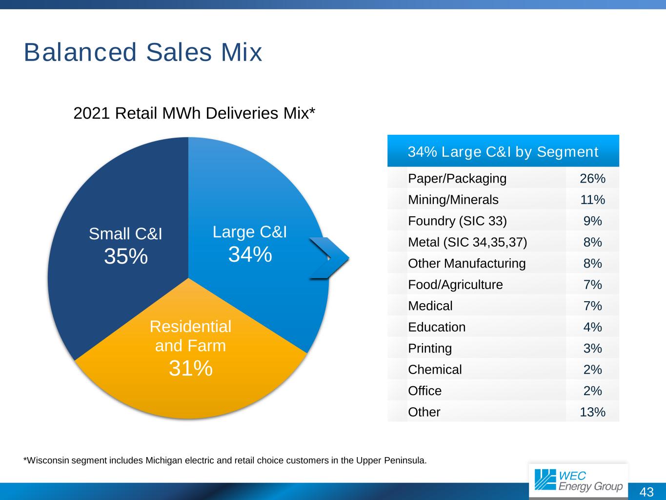 43 34% Large C&I by Segment Paper/Packaging 26% Mining/Minerals 11% Foundry (SIC 33) 9% Metal (SIC 34,35,37) 8% Other Manufacturing 8% Food/Agriculture 7% Medical 7% Education 4% Printing 3% Chemical 2% Office 2% Other 13% Balanced Sales Mix Large C&I 34% Residential and Farm 31% Small C&I 35% 2021 Retail MWh Deliveries Mix* *Wisconsin segment includes Michigan electric and retail choice customers in the Upper Peninsula.