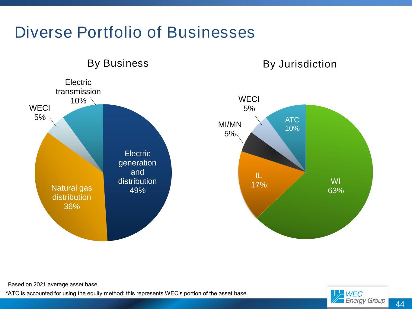 44 Diverse Portfolio of Businesses Based on 2021 average asset base. WI 63% IL 17% MI/MN 5% WECI 5% ATC 10% By Jurisdiction By Business Electric generation and distribution 49%Natural gas distribution 36% WECI 5% Electric transmission 10% *ATC is accounted for using the equity method; this represents WEC’s portion of the asset base.