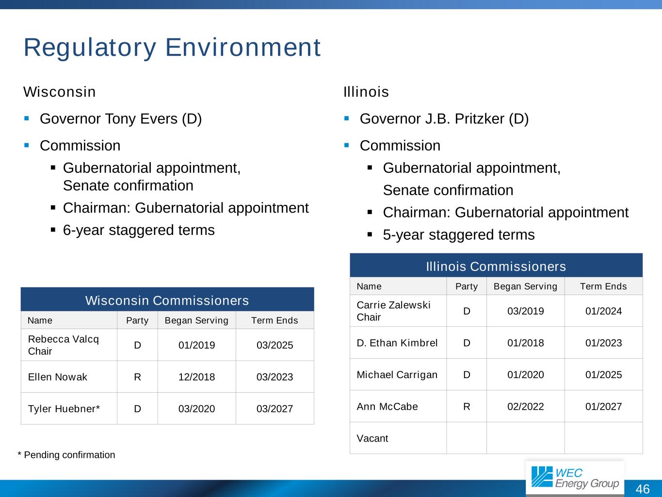 46 Regulatory Environment Wisconsin  Governor Tony Evers (D)  Commission  Gubernatorial appointment, Senate confirmation  Chairman: Gubernatorial appointment  6-year staggered terms Illinois  Governor J.B. Pritzker (D)  Commission  Gubernatorial appointment, Senate confirmation  Chairman: Gubernatorial appointment  5-year staggered terms Wisconsin Commissioners Name Party Began Serving Term Ends Rebecca Valcq Chair D 01/2019 03/2025 Ellen Nowak R 12/2018 03/2023 Tyler Huebner* D 03/2020 03/2027 Illinois Commissioners Name Party Began Serving Term Ends Carrie Zalewski Chair D 03/2019 01/2024 D. Ethan Kimbrel D 01/2018 01/2023 Michael Carrigan D 01/2020 01/2025 Ann McCabe R 02/2022 01/2027 Vacant * Pending confirmation