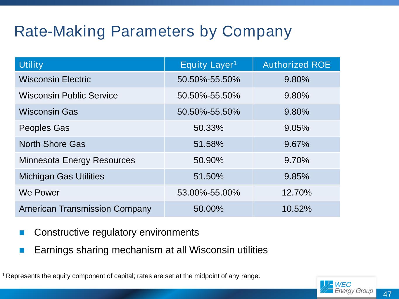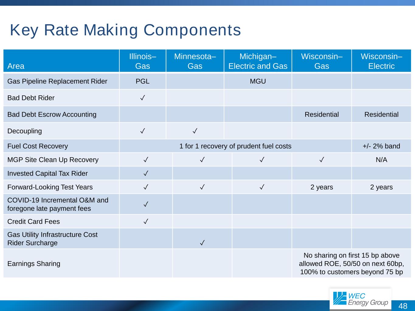 47 Rate-Making Parameters by Company Utility Equity Layer1 Authorized ROE Wisconsin Electric 50.50%-55.50% 9.80% Wisconsin Public Service 50.50%-55.50% 9.80% Wisconsin Gas 50.50%-55.50% 9.80% Peoples Gas 50.33% 9.05% North Shore Gas 51.58% 9.67% Minnesota Energy Resources 50.90% 9.70% Michigan Gas Utilities 51.50% 9.85% We Power 53.00%-55.00% 12.70% American Transmission Company 50.00% 10.52% 1 Represents the equity component of capital; rates are set at the midpoint of any range.  Constructive regulatory environments  Earnings sharing mechanism at all Wisconsin utilities